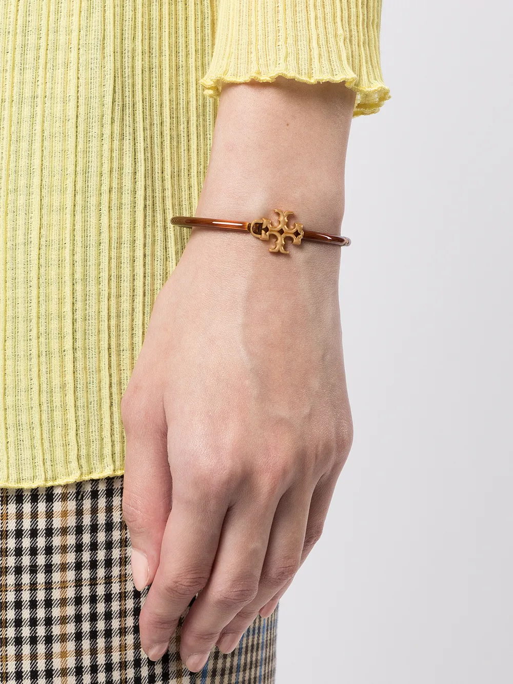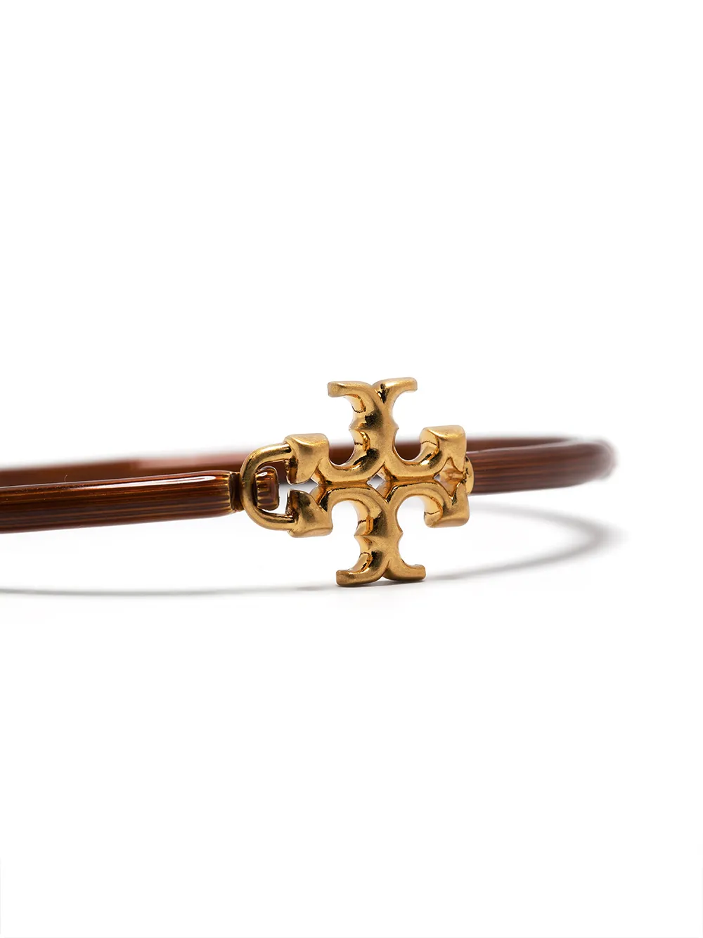 Tan brown metal Kira enamel cuff bracelet from TORY BURCH featuring gold-tone logo plaque and clasp fastening.