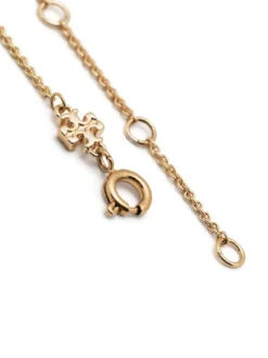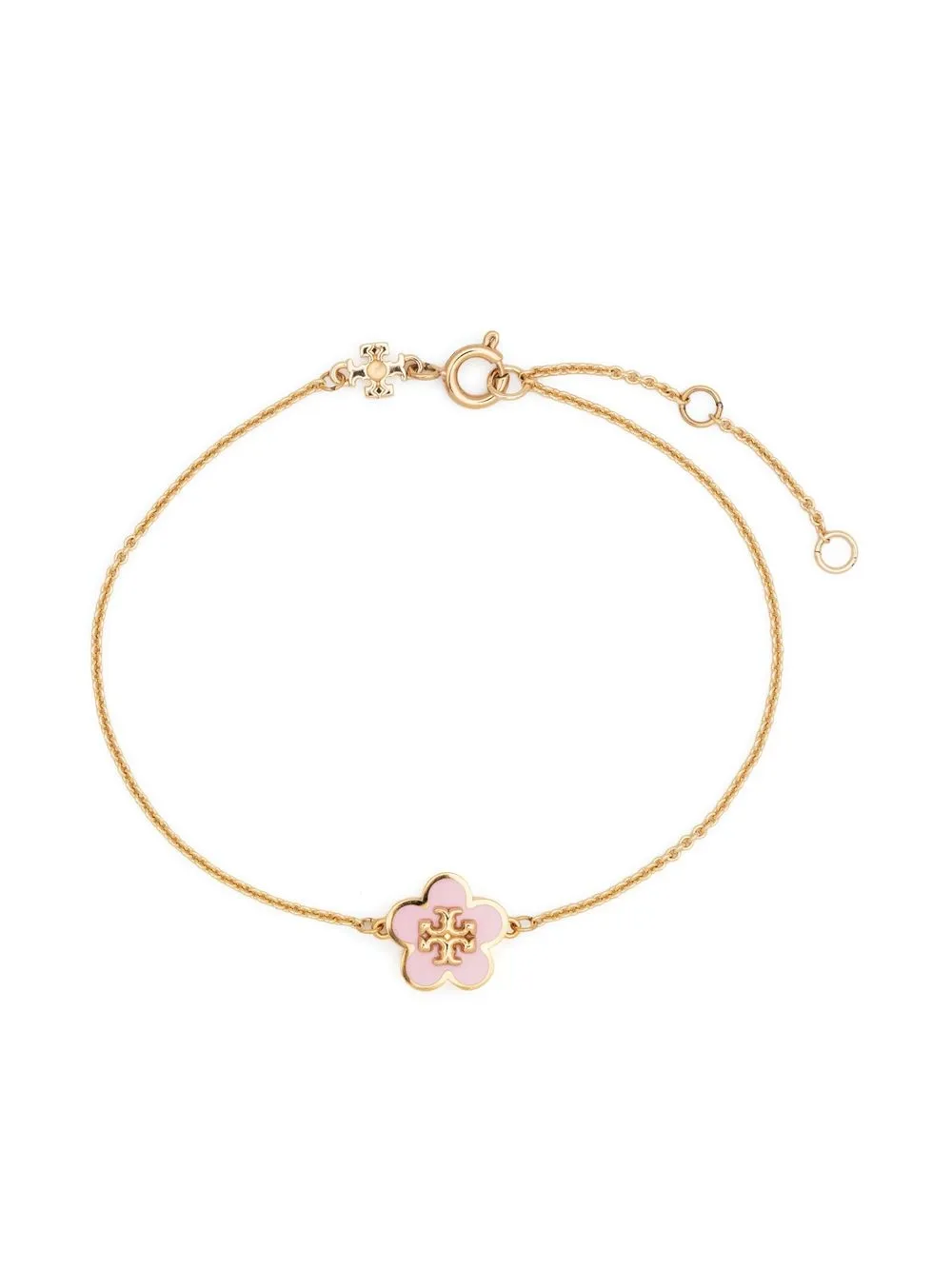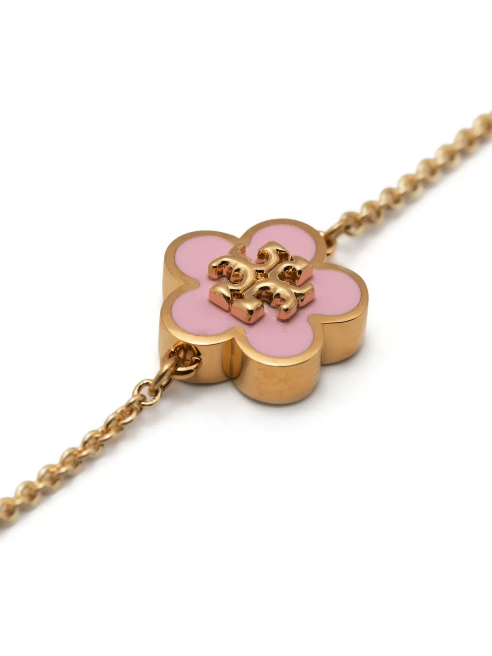 This delicate gold-tone bracelet from Tory Burch is characterised by the floral charm, imagined in a blush pink hue for SS23.