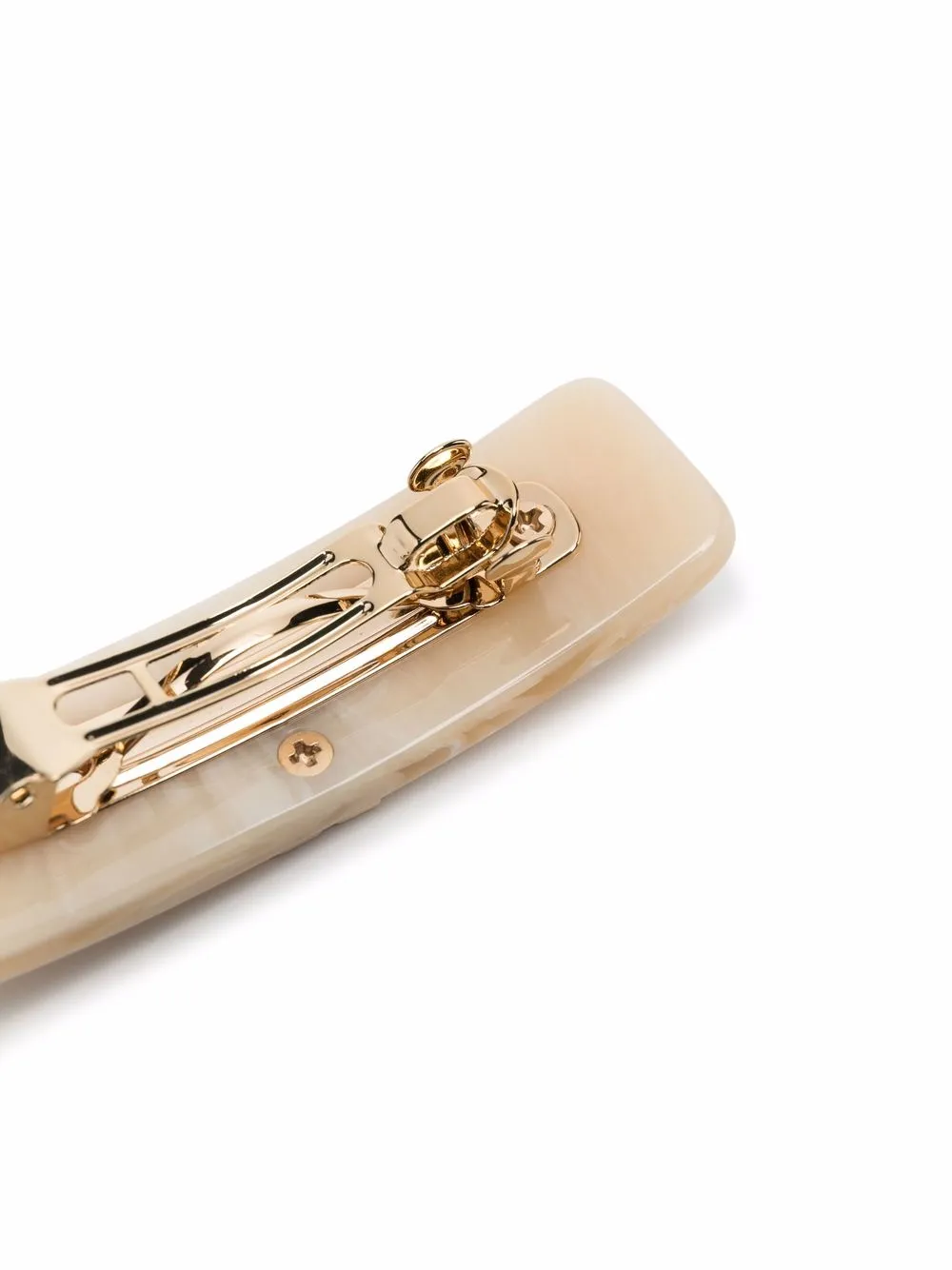 Tory gold/ivory Kira logo-charm barrete hair clip from TORY BURCH featuring logo plaque, marbled pattern and clasp fastening.