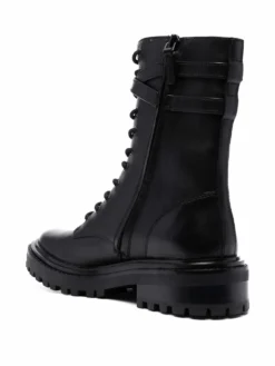 Black leather lace-up combat boots from TORY BURCH featuring gold-tone logo plaque, round toe, front lace-up fastening and ridged rubber sole.