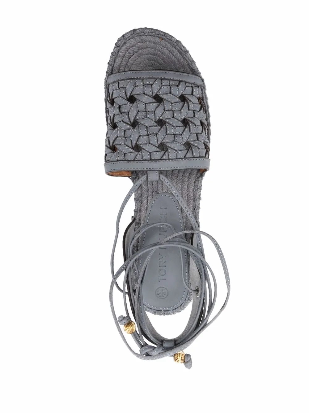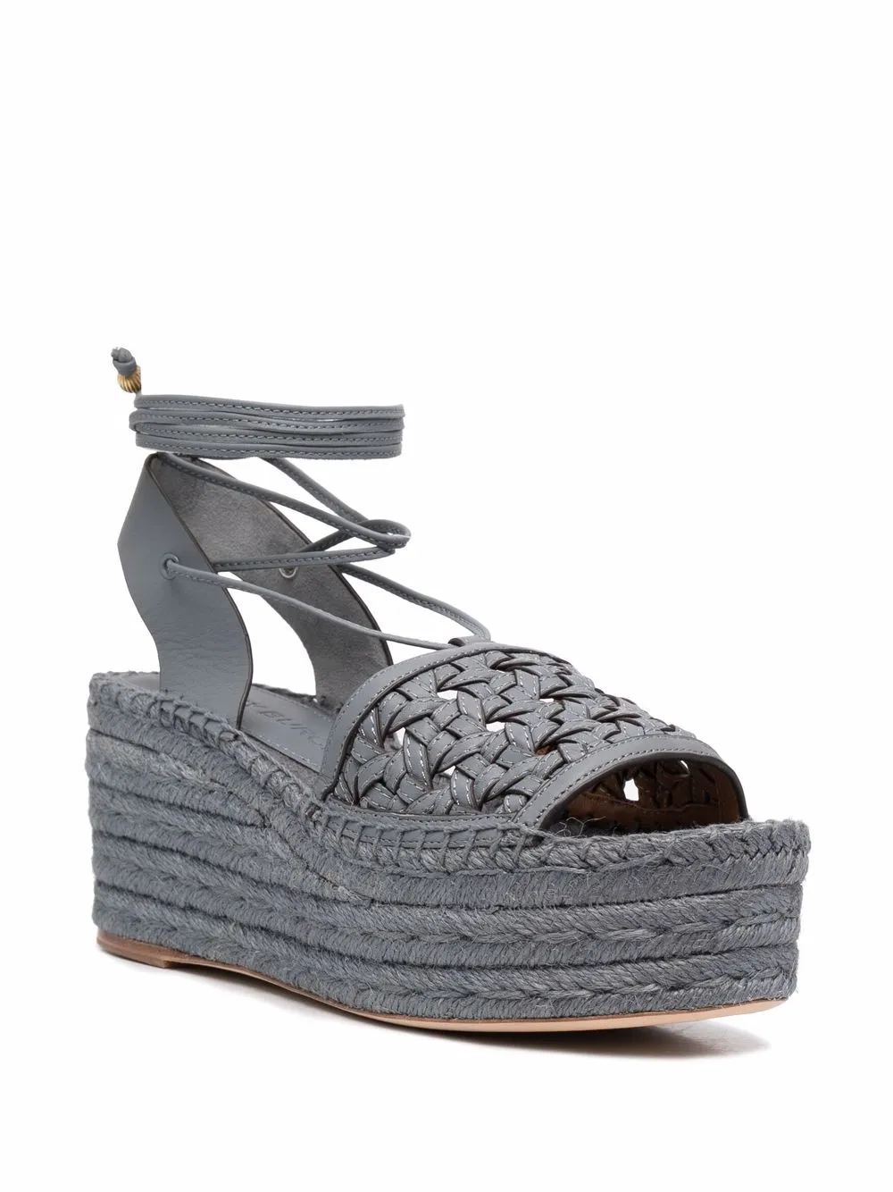 Grey-blue leather lace-up platform espadrilles from TORY BURCH featuring interwoven design, open toe, single toe strap, front lace-up fastening, branded insole and platform sole.