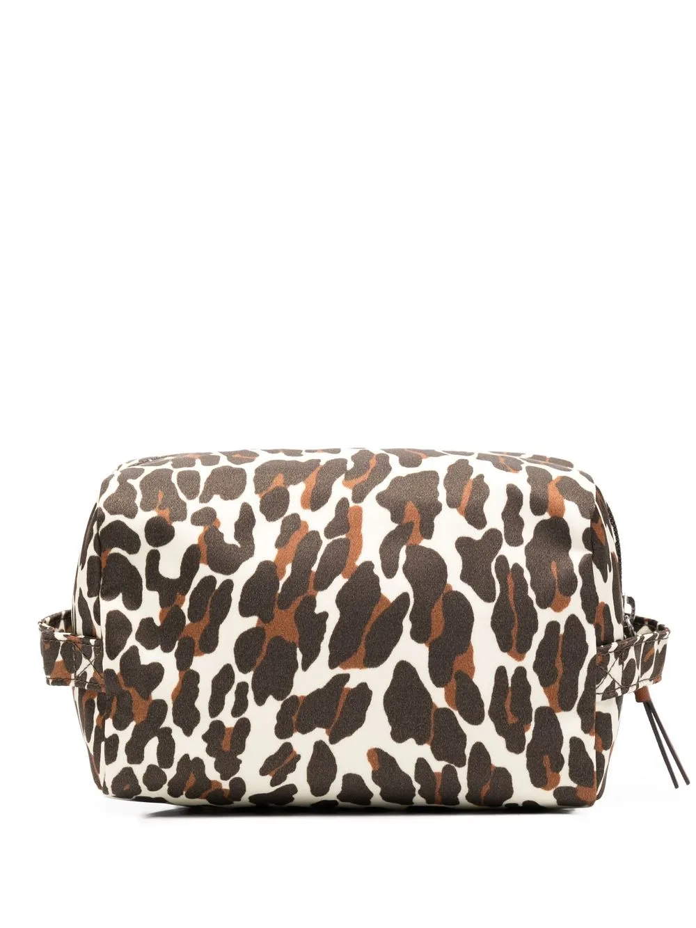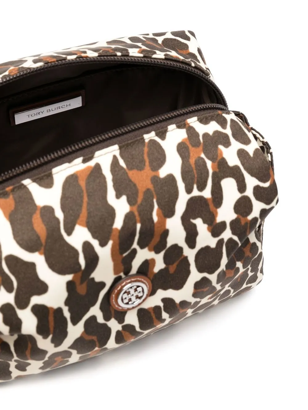 White/brown/black recycled nylon leopard-print make-up bag from Tory Burch featuring all-over leopard print, logo patch to the front, top zip fastening, single flat side handle and main compartment.