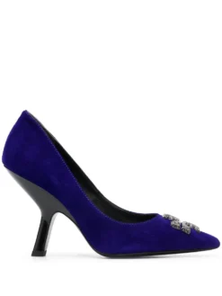 logo buckle suede pumps from TORY BURCH featuring calf suede, slip-on style, leather sole, deep purple, crystal embellish logo buckle to the vamp, pointed toe and angular 100 mm heel.