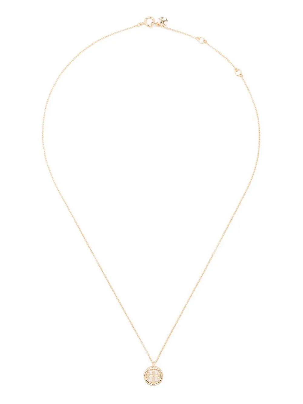 logo-charm necklace from TORY BURCH featuring gold-tone, brass, cable-link chain, logo charm and clasp fastening.