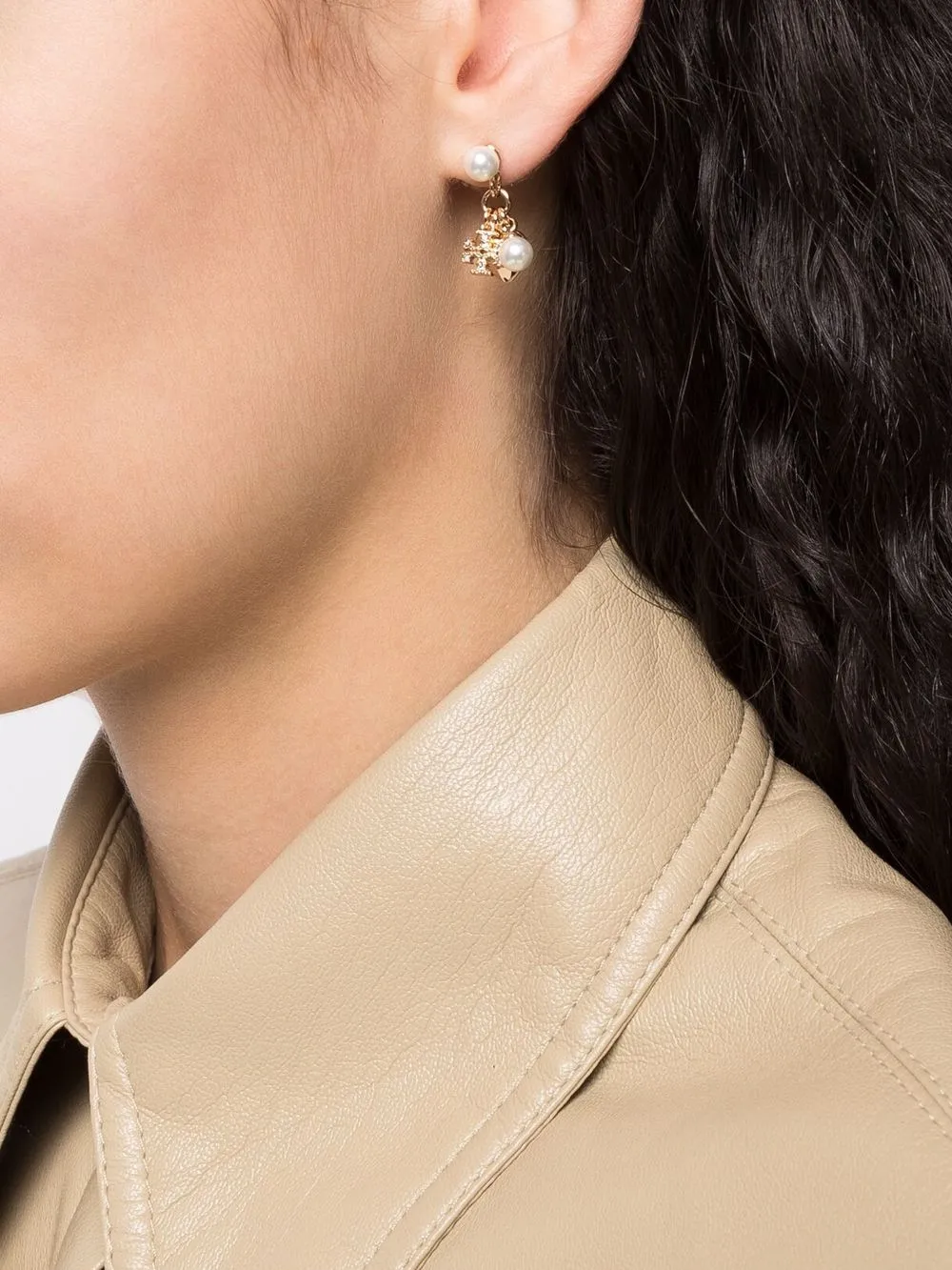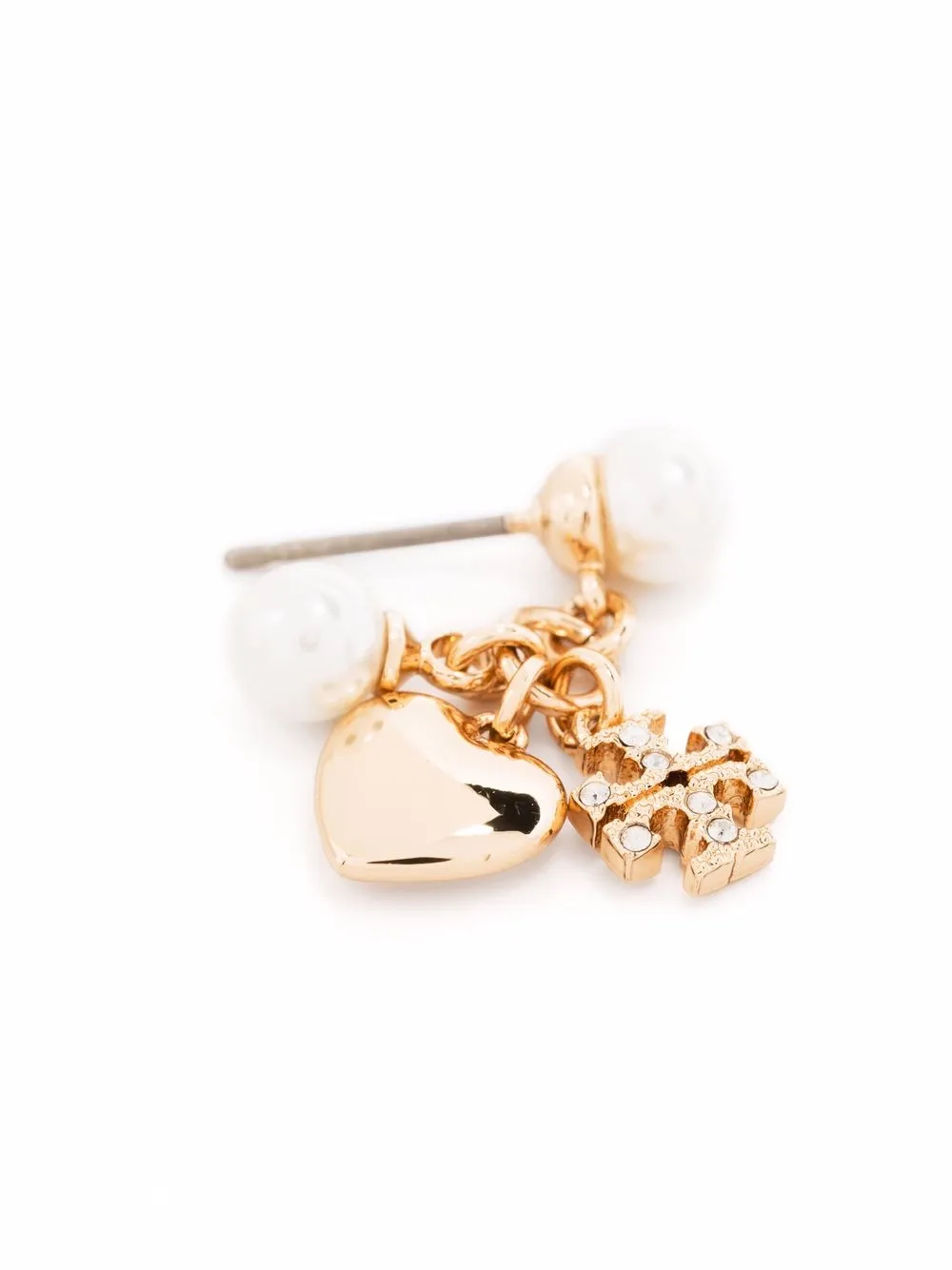 Embellished with Tory Burch’s signature Double T logo charm, these gold-toned earrings feature a pearl and heart pendant embellishment and fasten with a post-back closure.