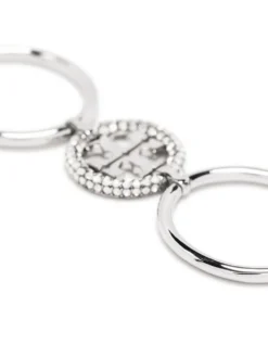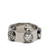 logo double ring from TORY BURCH featuring silver-tone, brass, logo plaque, crystal embellishment and double ring design.