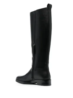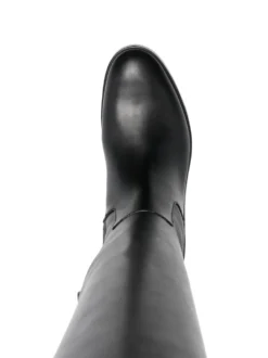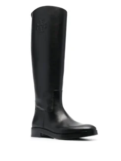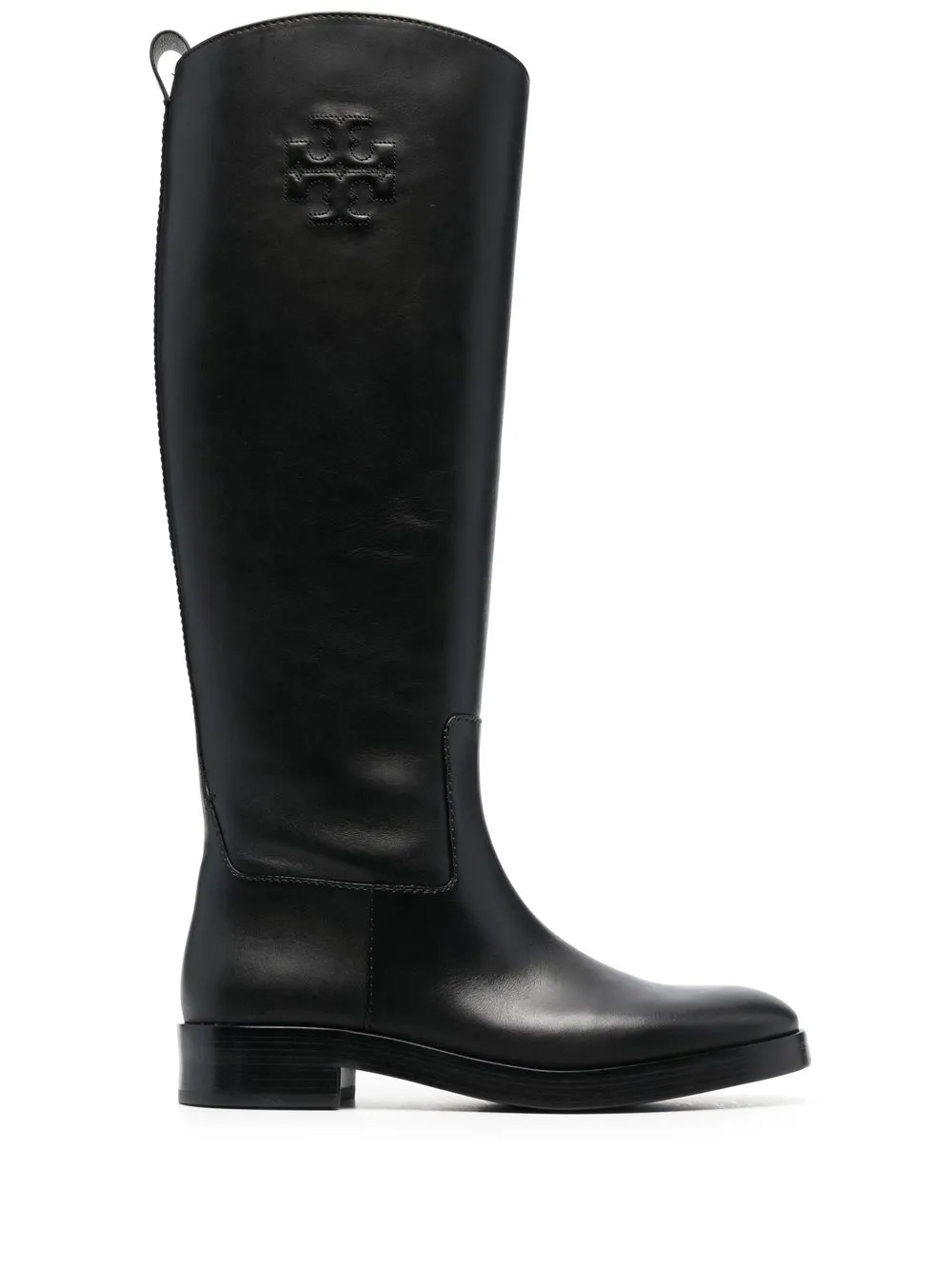 logo-embossed tall leather boots from TORY BURCH featuring black, calf leather, embossed logo to the side, signature Double T motif, pull-tab at the heel, almond toe, side zip fastening, low block heel and knee-high.