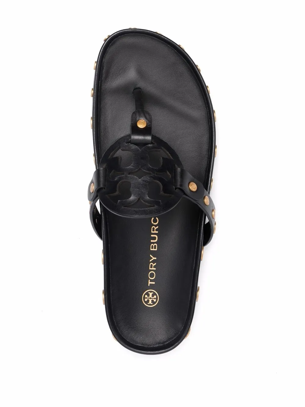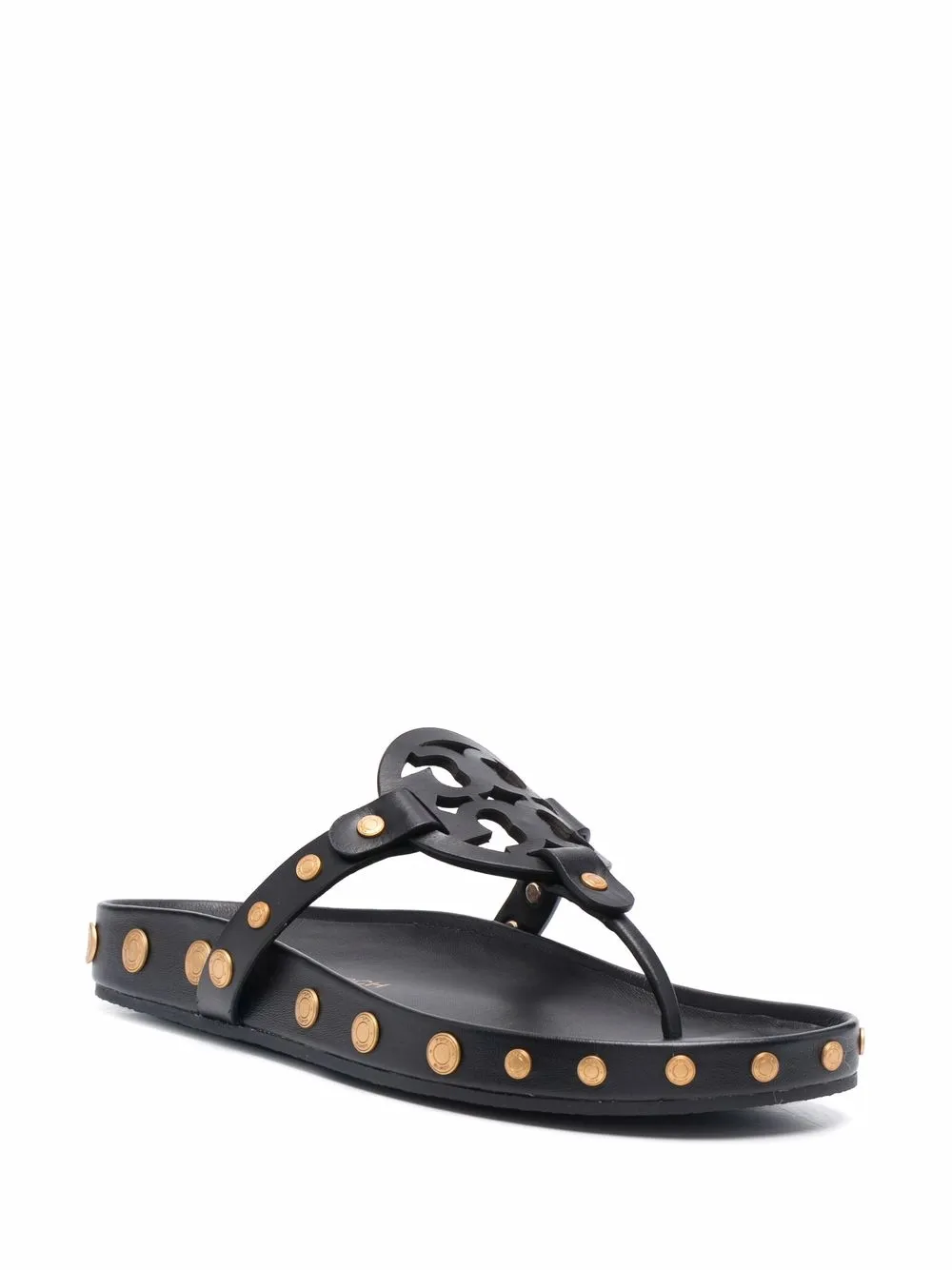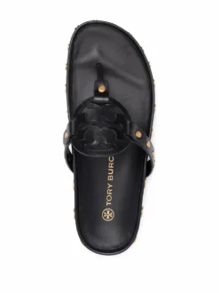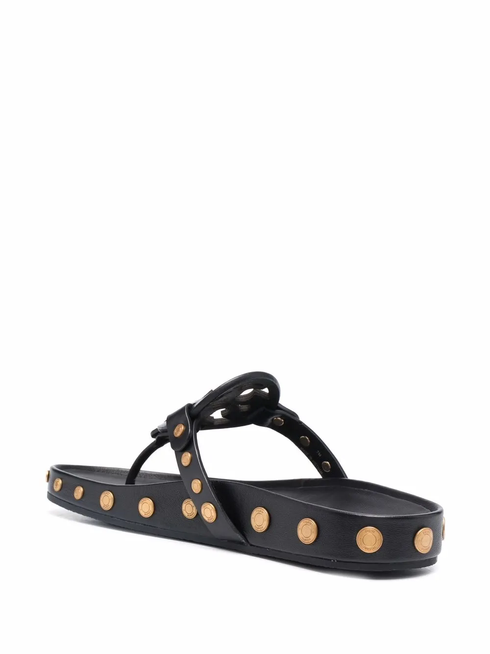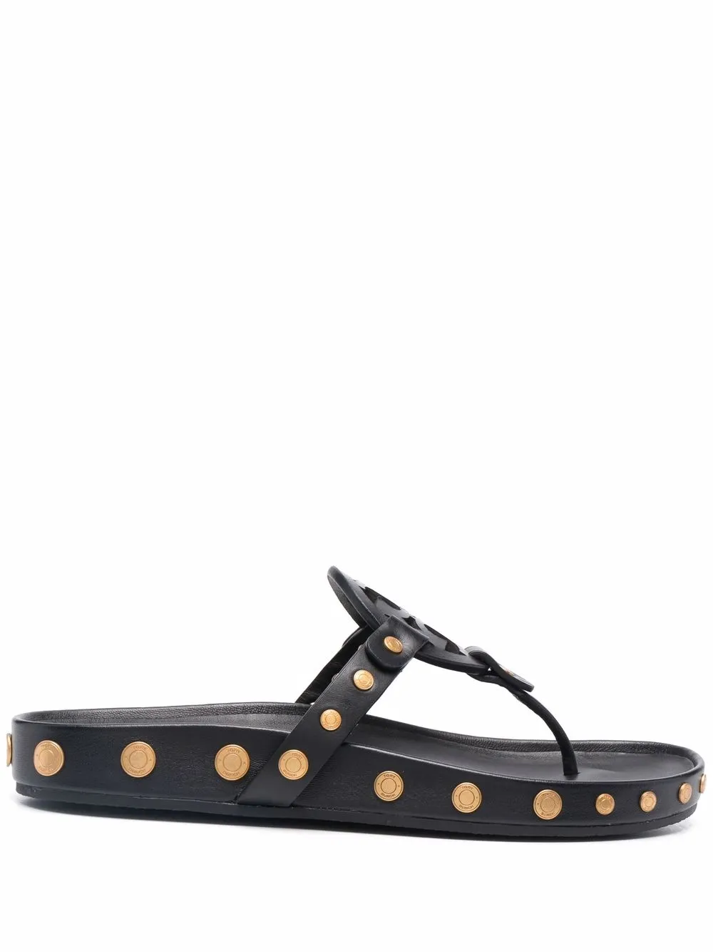 Black leather logo-patch detail flip-flops from TORY BURCH featuring gold-tone stud detailing, logo patch to the front, open toe, branded insole and flat rubber sole.