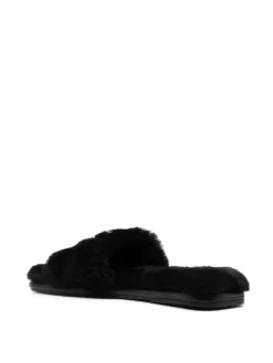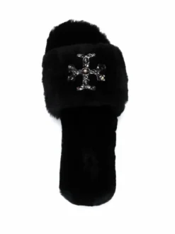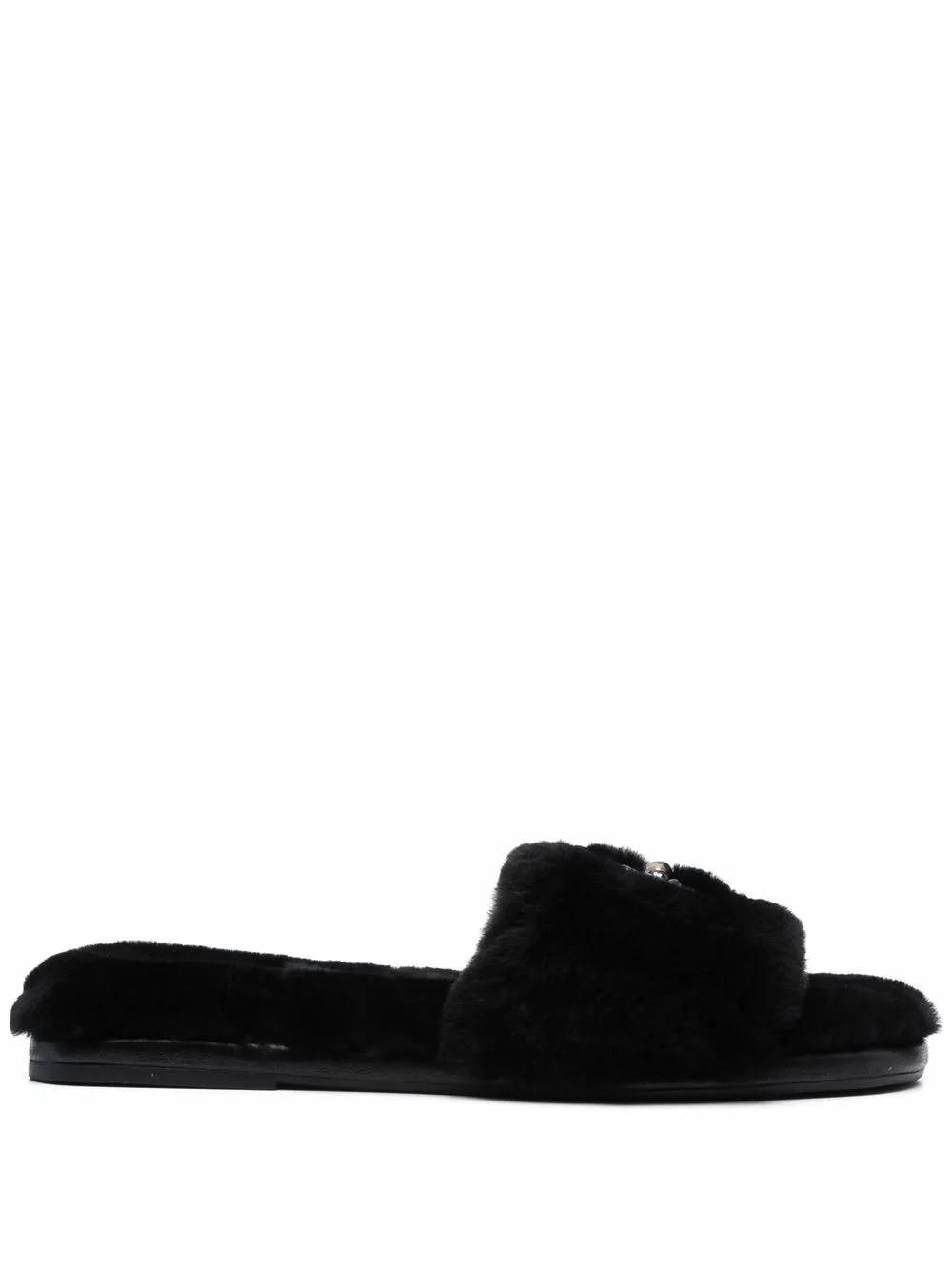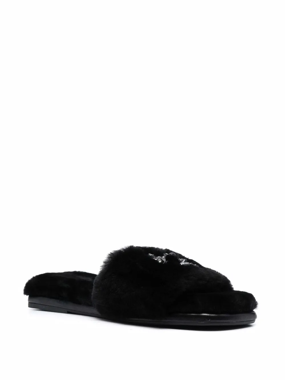 Black sheepskin/shearling logo-patch fur sliders from TORY BURCH featuring slip-on style, logo patch to the front and shearling design.