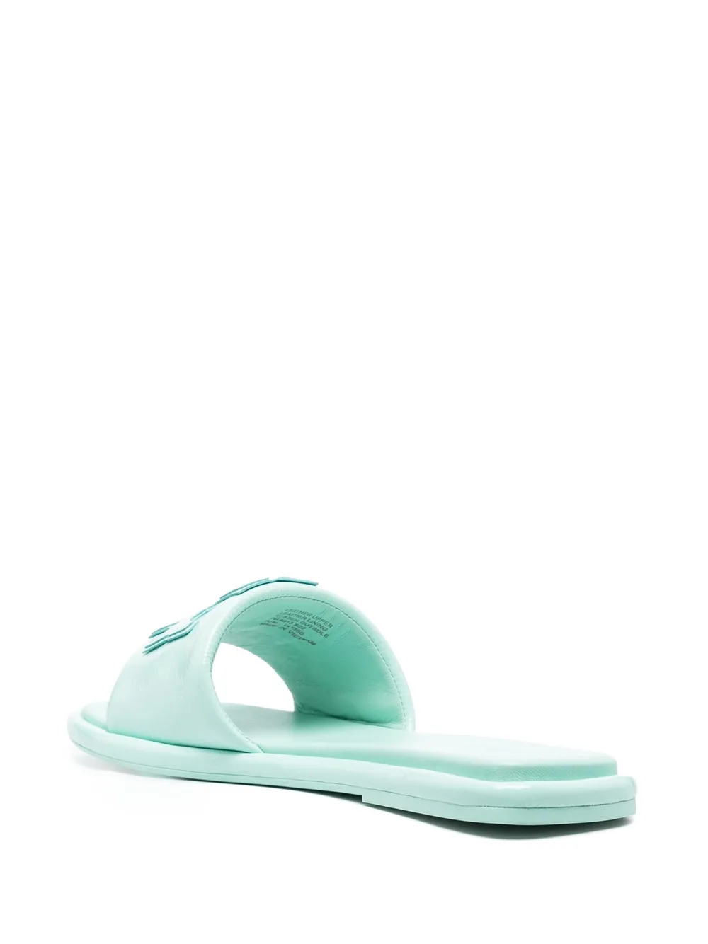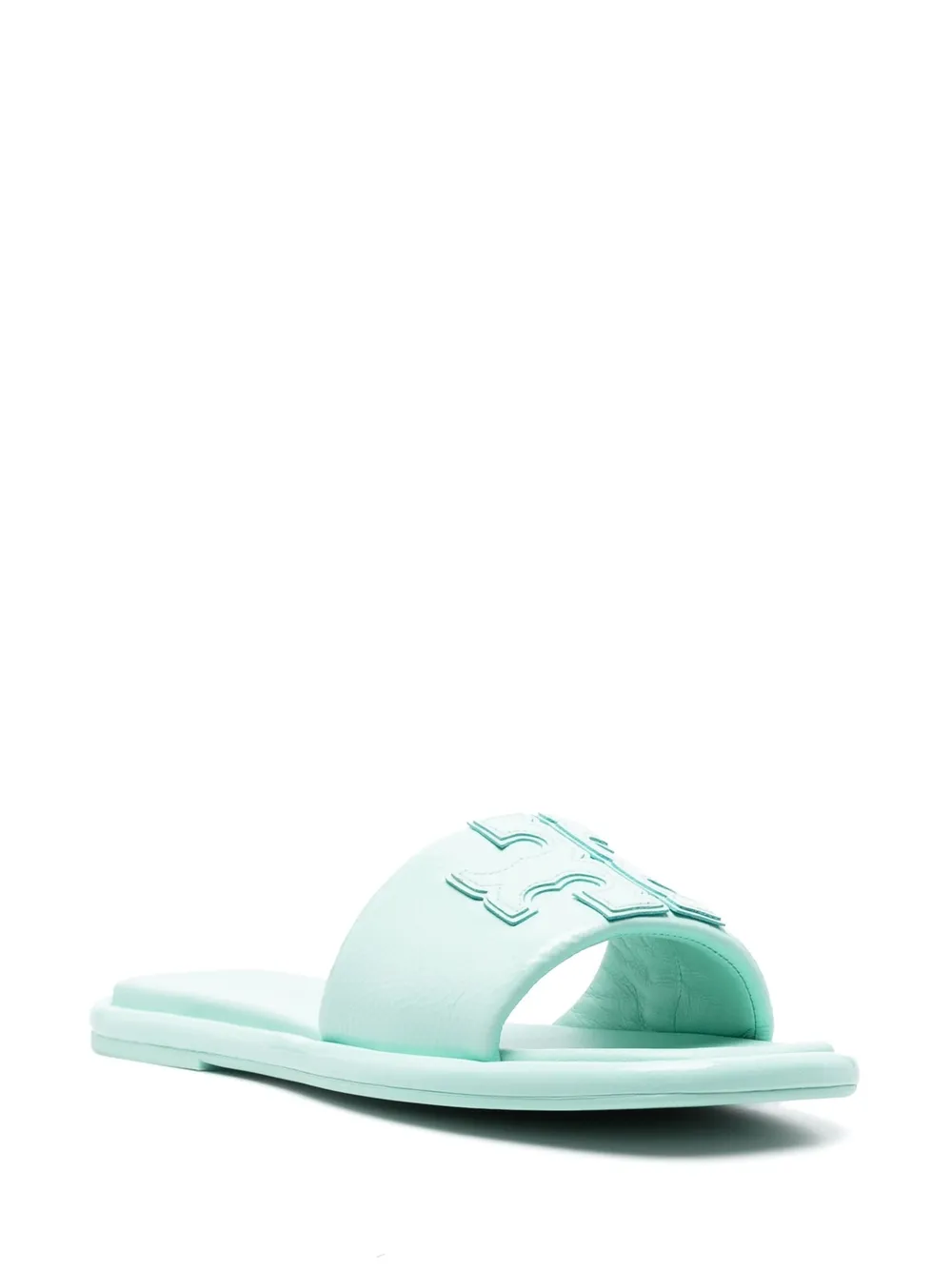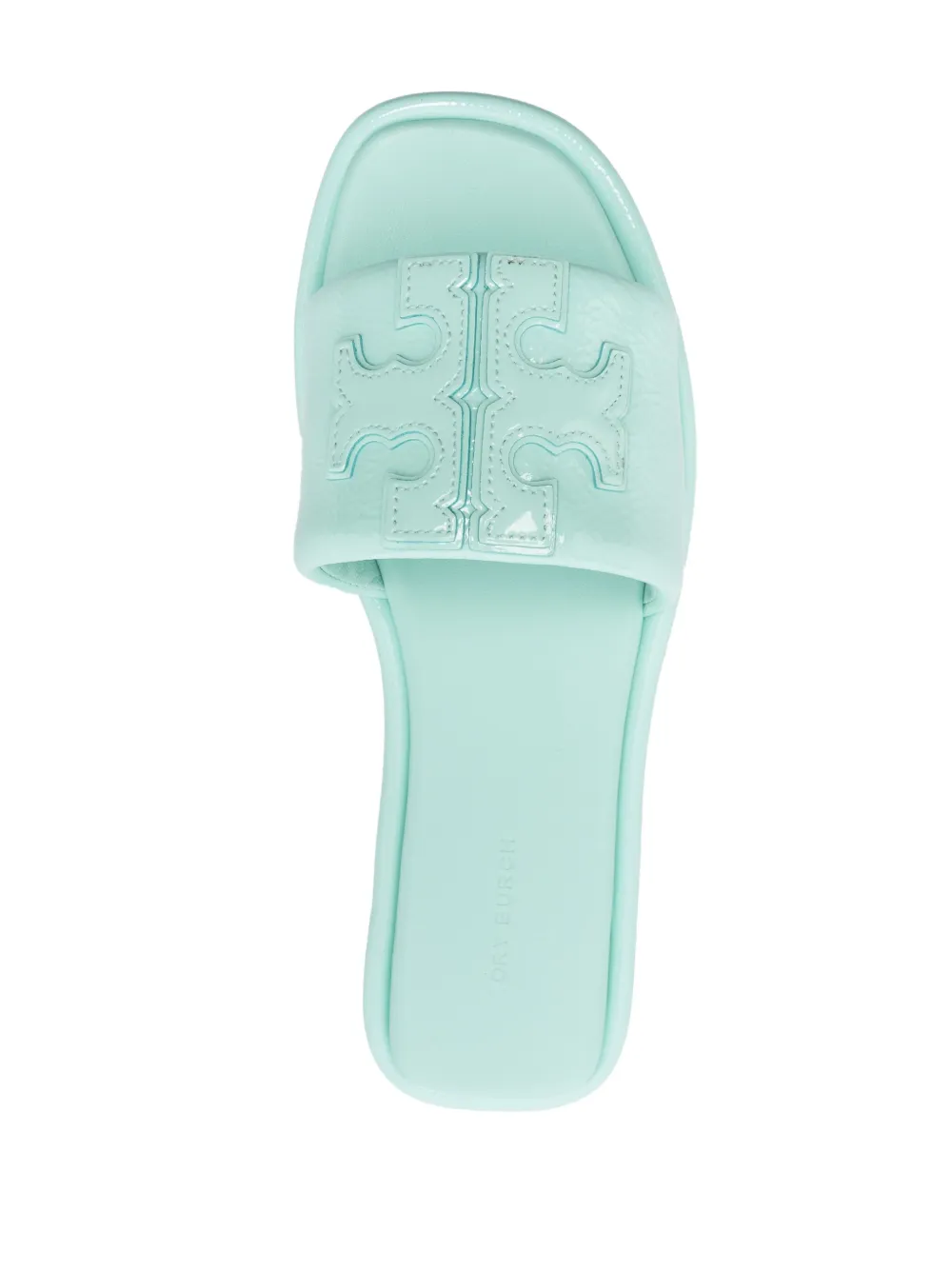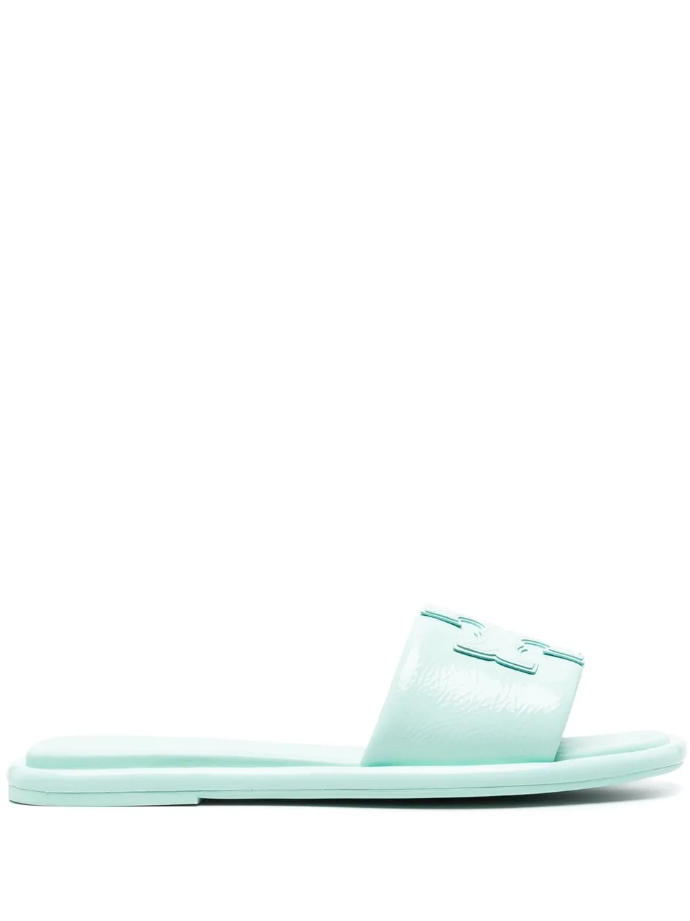 logo-patch slides from TORY BURCH featuring aqua green, calf leather, patent finish, open toe, branded footbed and flat rubber sole.