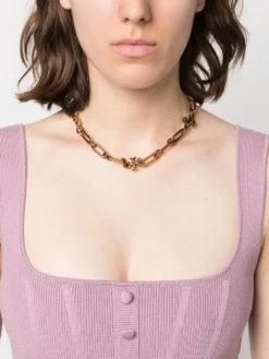 logo-plaque chain-link necklace from TORY BURCH featuring gold-tone, chain-link detailing, logo charm and gold-tone hardware.