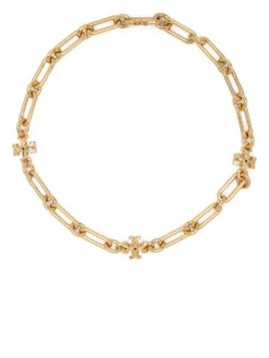 logo-plaque chain-link necklace from TORY BURCH featuring gold-tone, chain-link detailing, logo charm and gold-tone hardware.