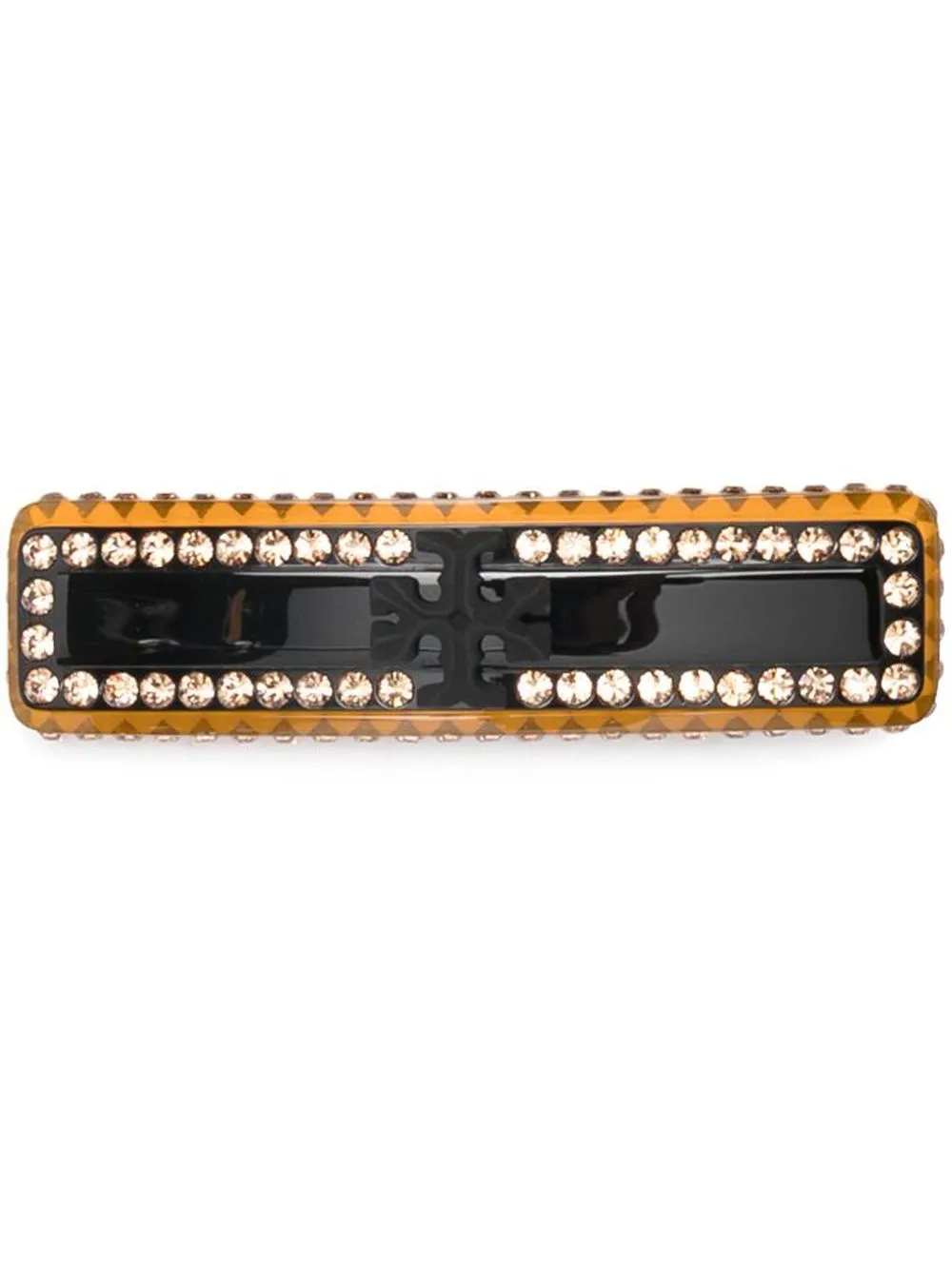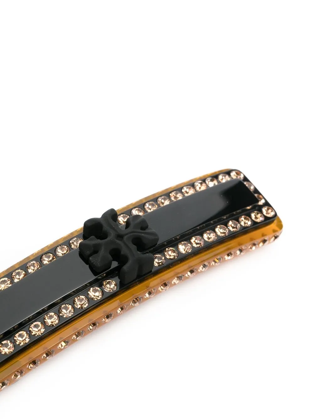 logo-plaque crystal clip from TORY BURCH featuring brown, logo plaque, crystal embellishment and clip fastening.