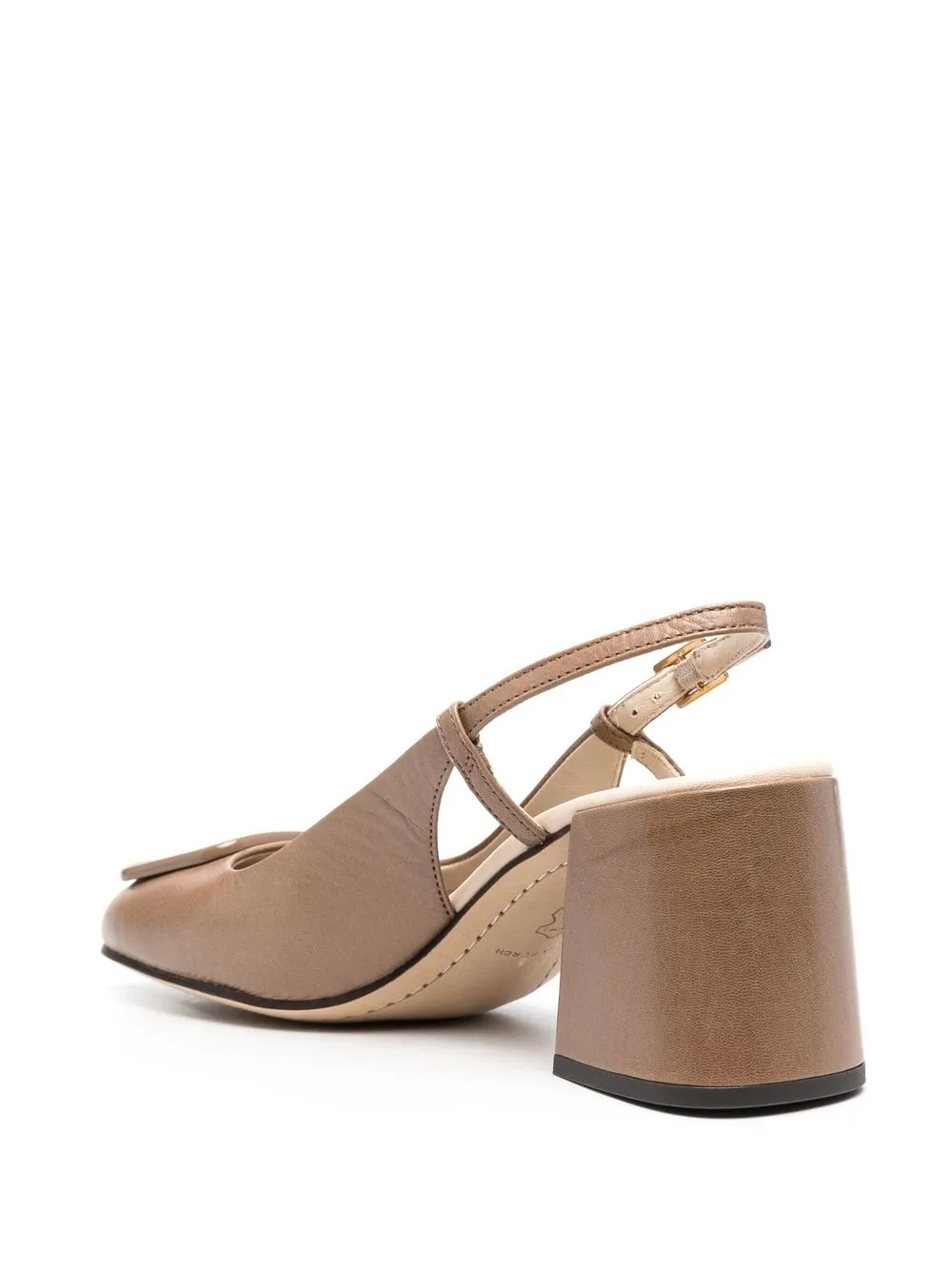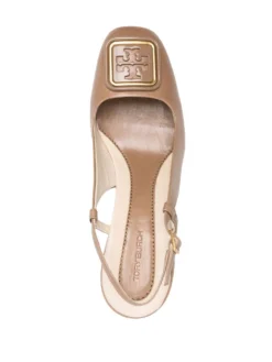 logo-plaque detail pumps from TORY BURCH featuring gold-tone logo plaque, buckle-fastening slingback strap, round toe, branded insole, mid block heel, almond brown and leather.