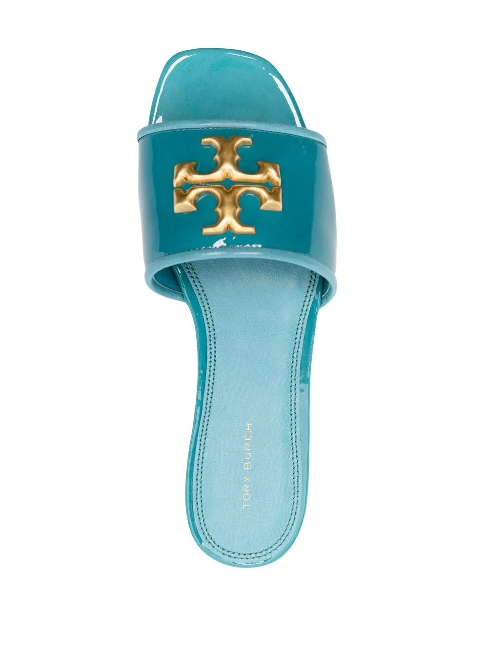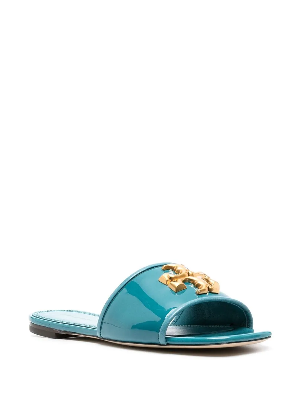 logo-plaque Eleanor sliders from TORY BURCH featuring alice blue, leather, patent finish, gold-tone logo plaque, open toe, slip-on style and flat leather sole.