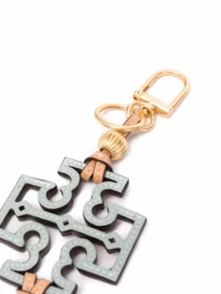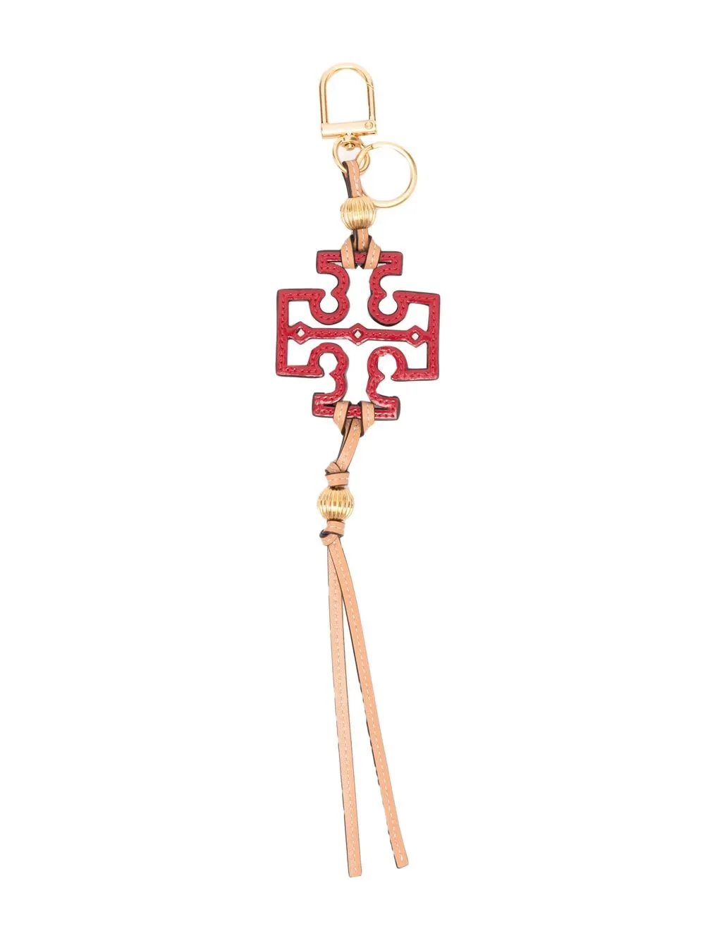Green calf leather logo-plaque keyring from TORY BURCH featuring gold-tone hardware, logo plaque and tassel detail.