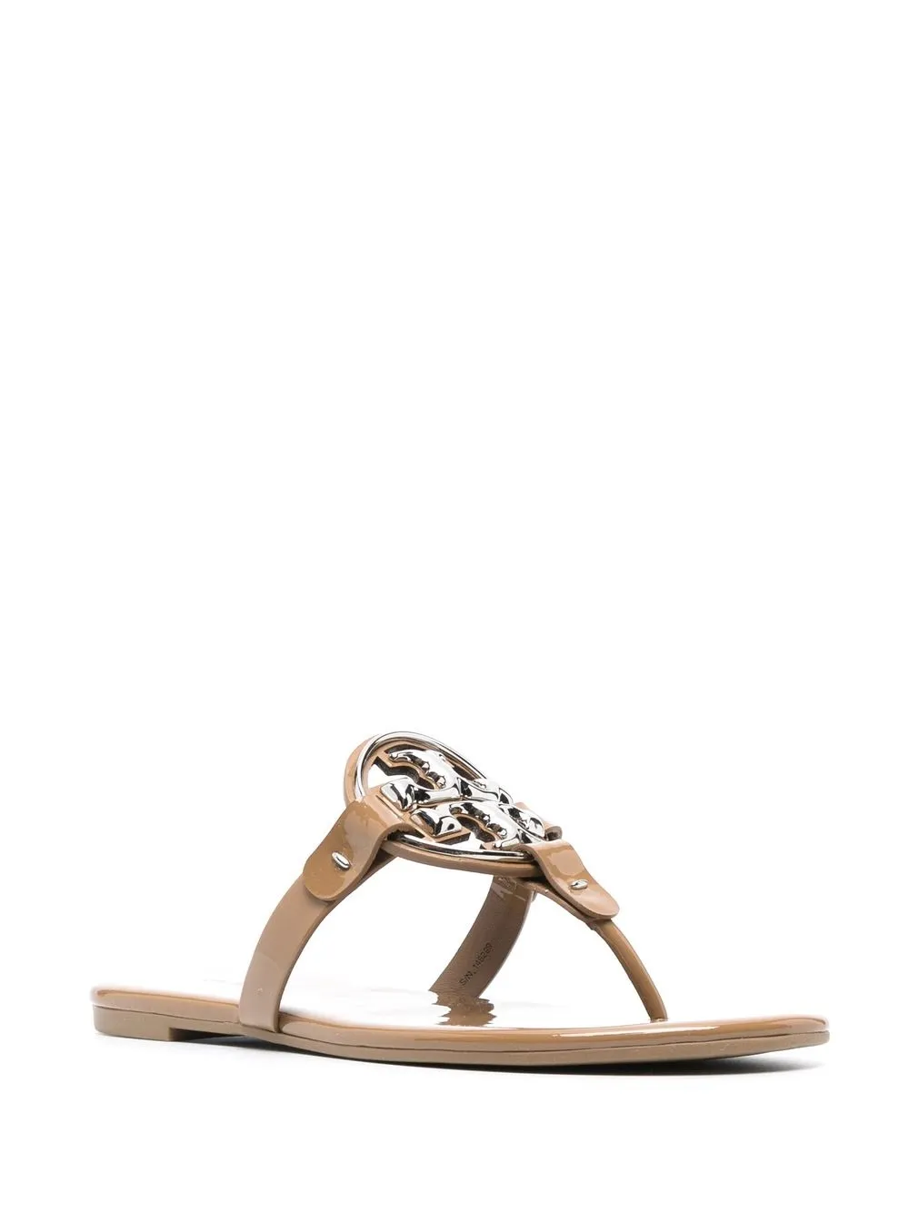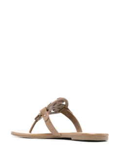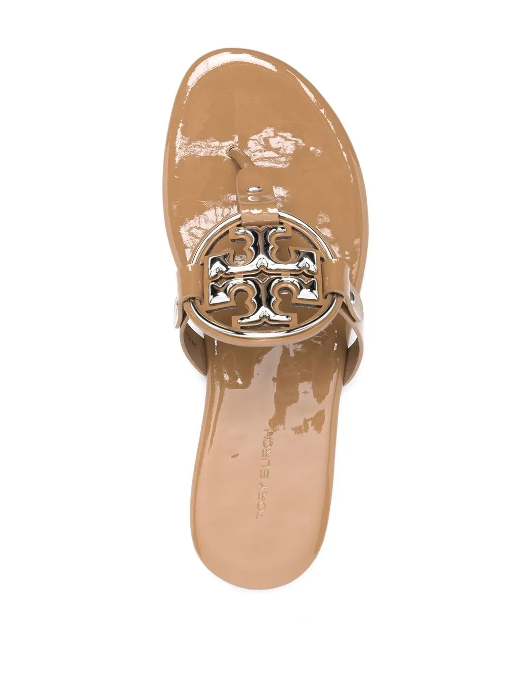 logo-plaque open-toe slides from TORY BURCH featuring cedar brown, calf leather, logo plaque, open toe, low heel and slip-on style.