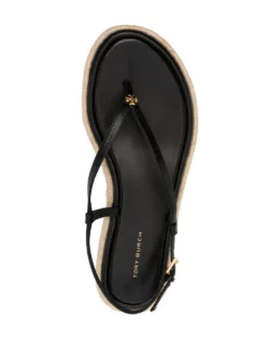 logo-plaque thong-strap sandals from TORY BURCH featuring buckle-fastening ankle strap, braided raffia sole, black, goat skin, calf leather, gold-tone logo plaque and thong strap.