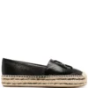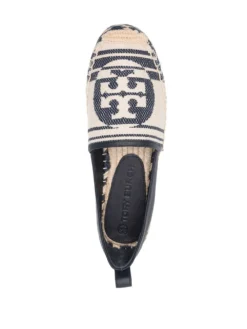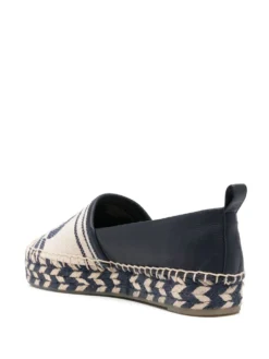 logo-print detail espadrilles from TORY BURCH featuring logo print to the front, round toe, branded insole, flat rubber sole, beige and navy blue.