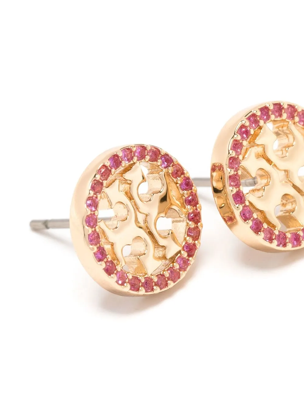 logo stud earrings from TORY BURCH featuring gold-tone, logo plaque, crystal embellishment, polished effect, stud design and butterfly fastening. These earrings come as a pair..