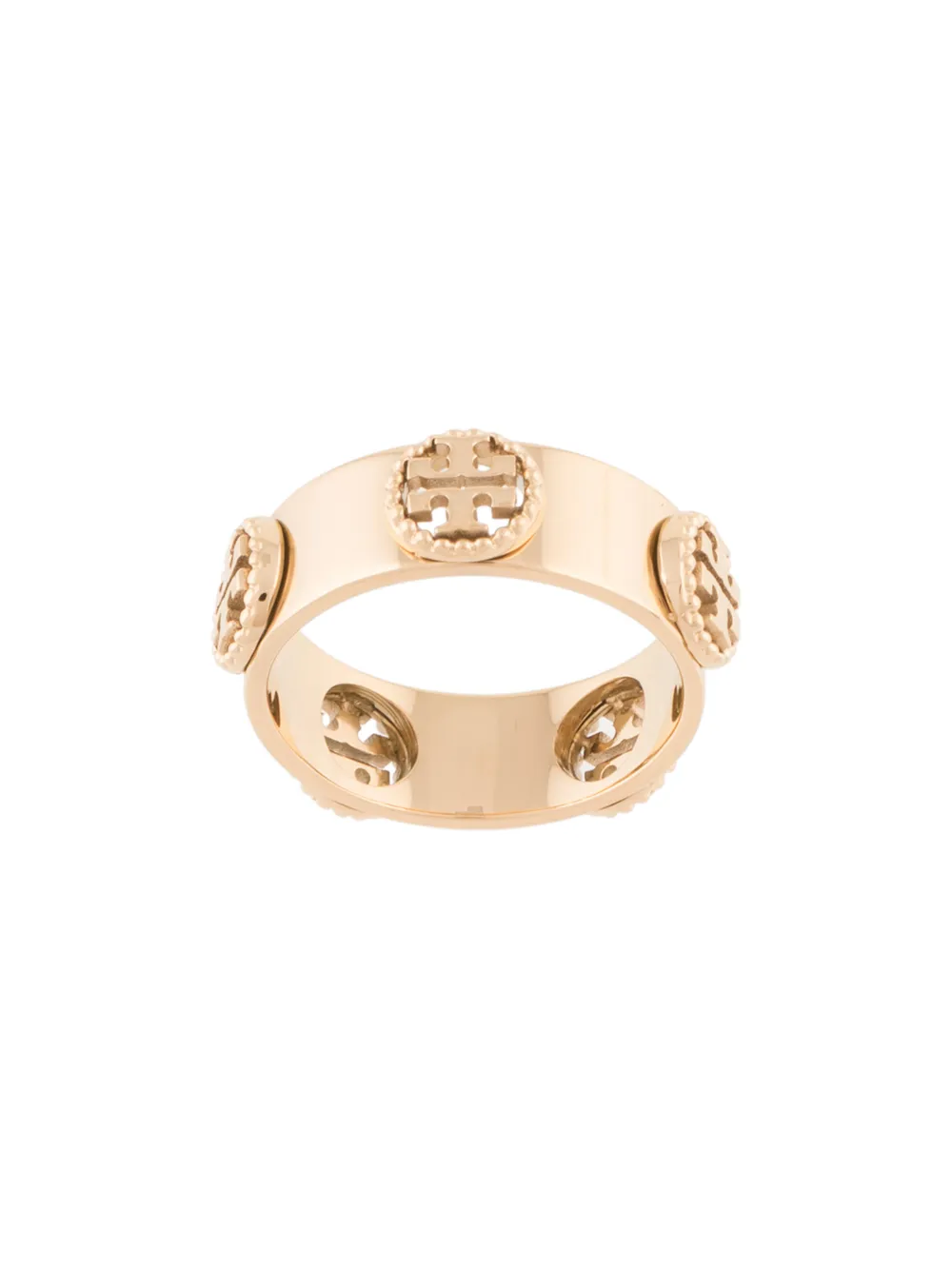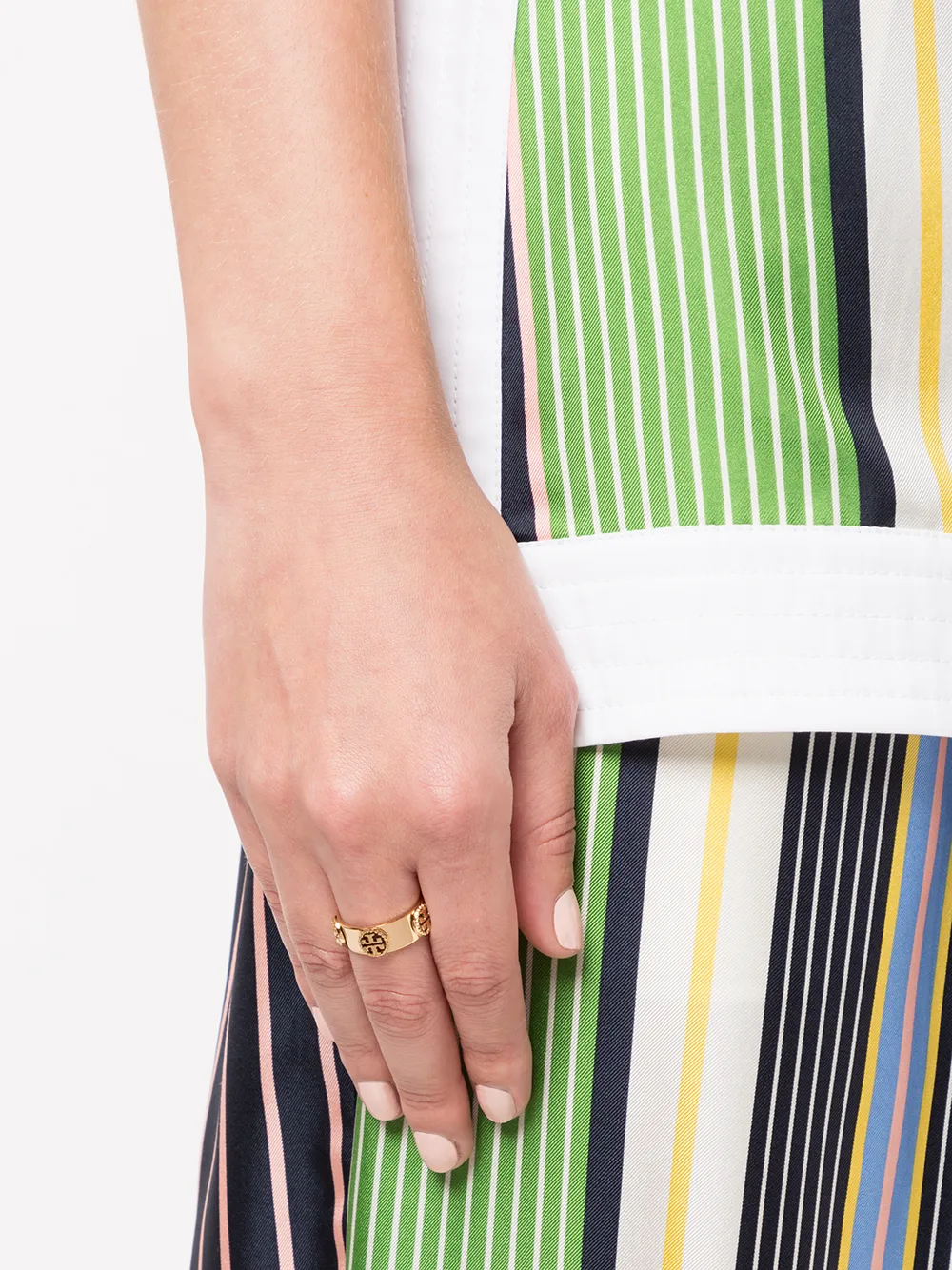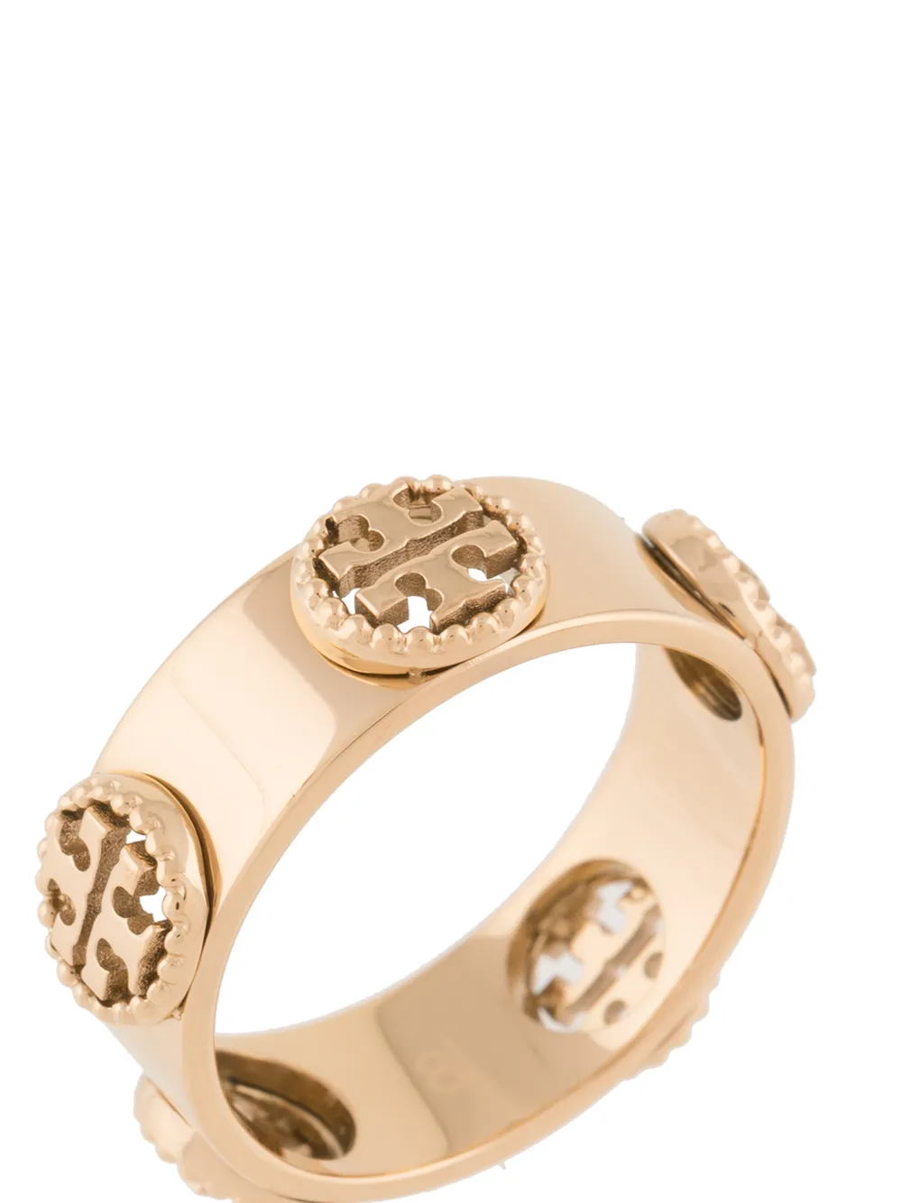 Yellow stainless steel Milgrain logo-plaque ring from Tory Burch featuring gold-tone hardware, a logo plaque and a polished finish.