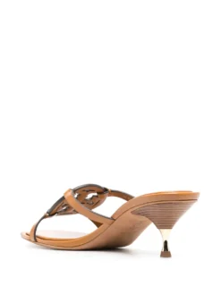 Rendered in a caramel corn brown hue, Tory Burch presents these sandals. Defined by the brand’s signature Double T motif at the upper for a branding-focused finish, the slip-on pair rests on a tapered heel.