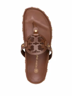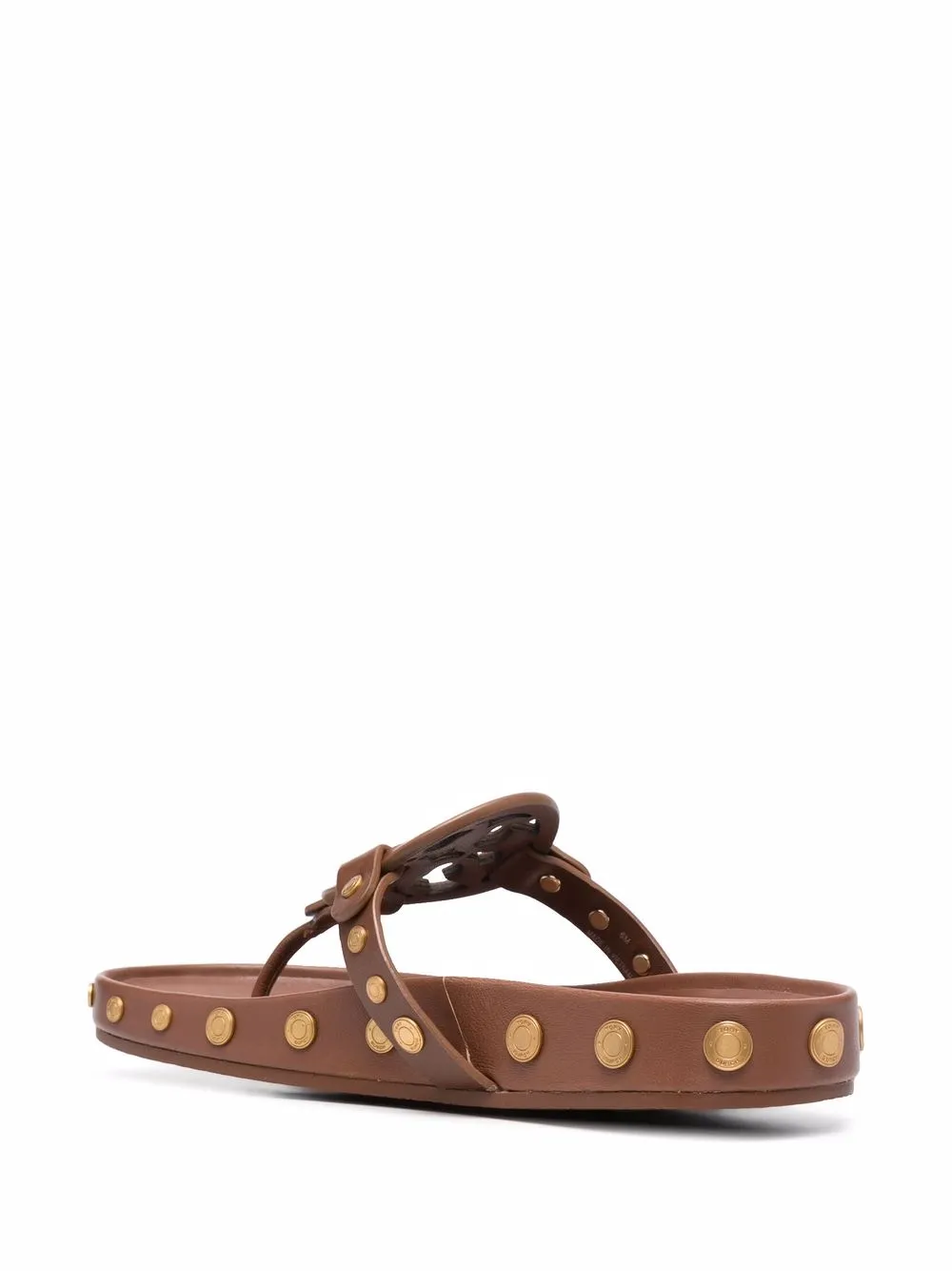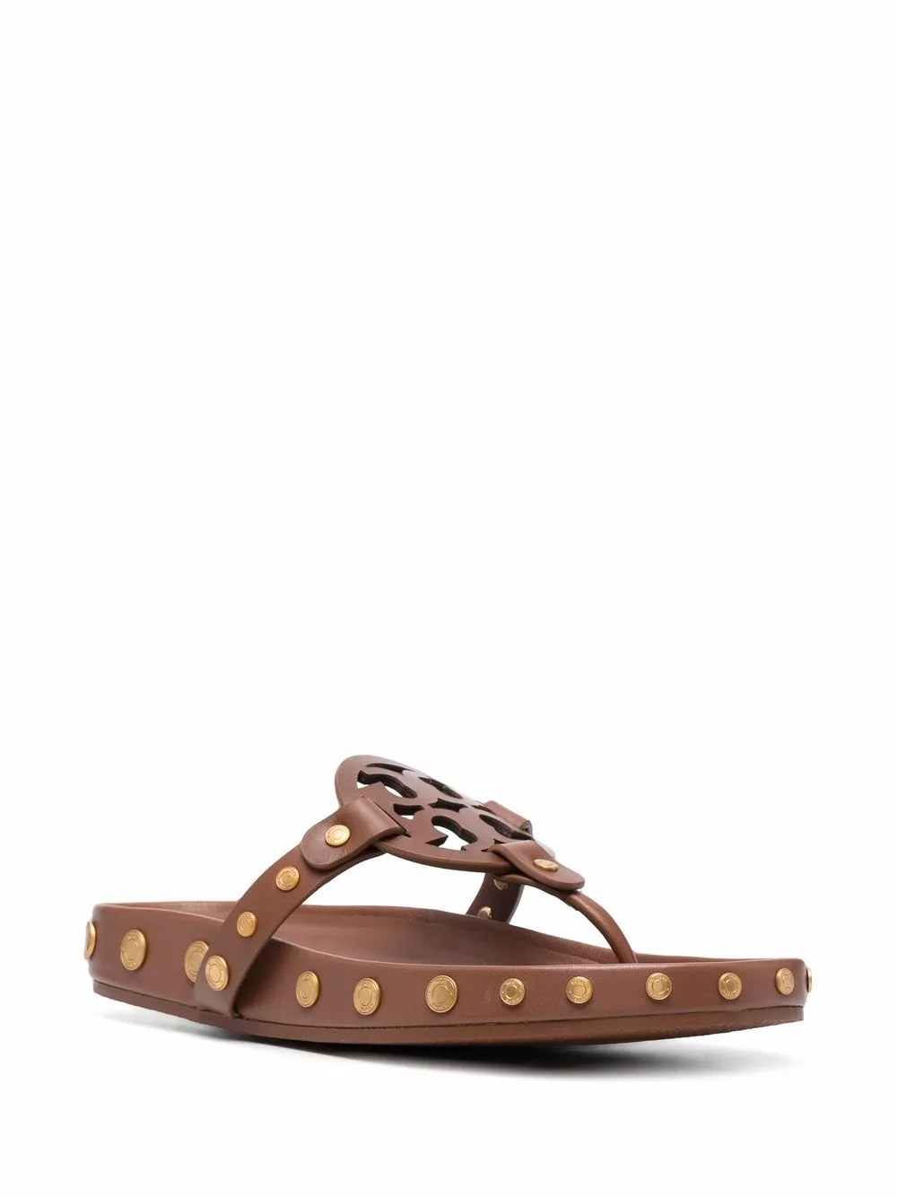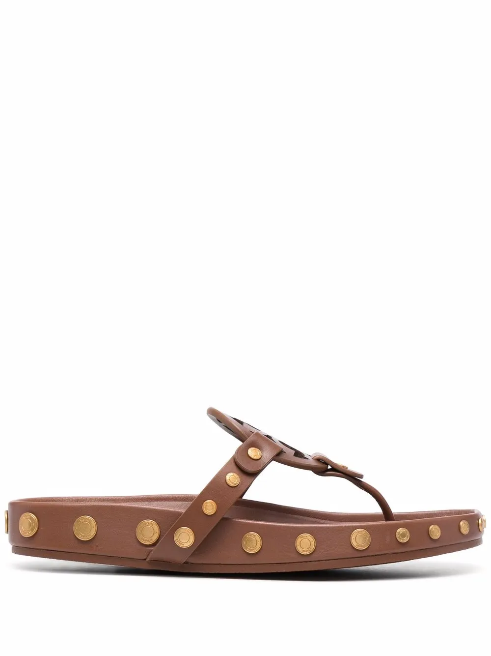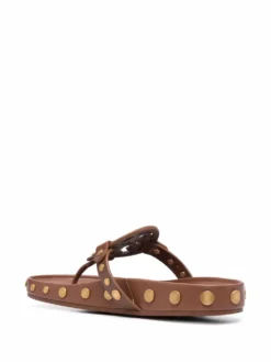 Brown leather Miller flip flops from TORY BURCH featuring stud embellishment, logo patch to the front, thong strap, open toe and flat rubber sole.