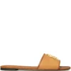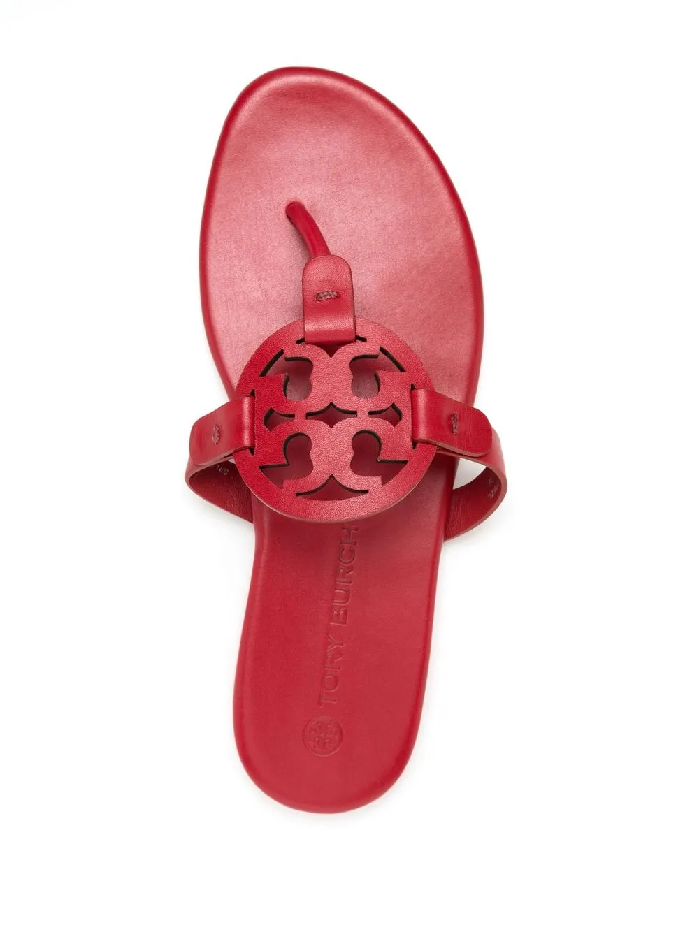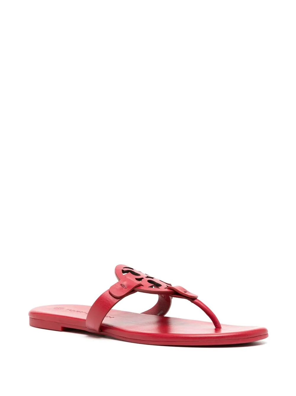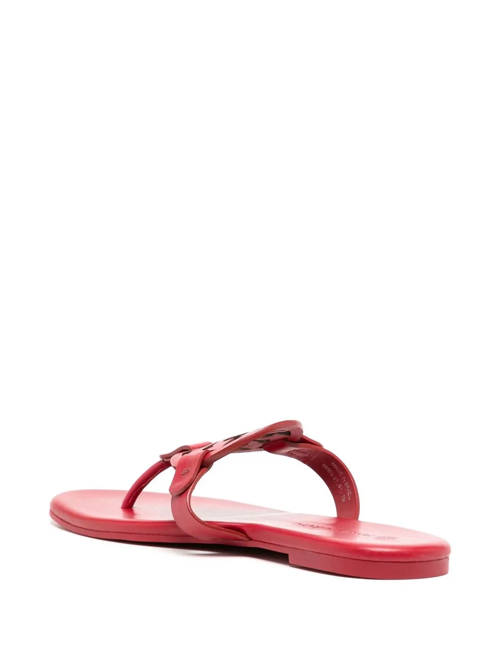 Miller flip flops from TORY BURCH featuring red, leather, logo plaque, flat rubber sole and slip-on style.