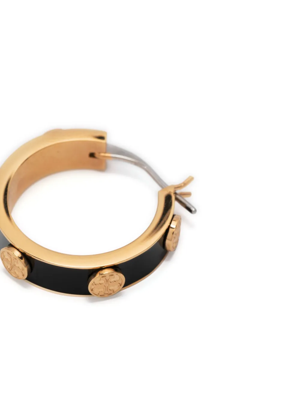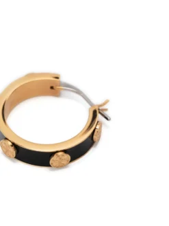 The Miller hoop earrings from Tory Burch are presented for AW23 in a black iteration with elegant gold-tone hardware. They’re defined by the Double T motif, coming in the form of studs that surround the pair.