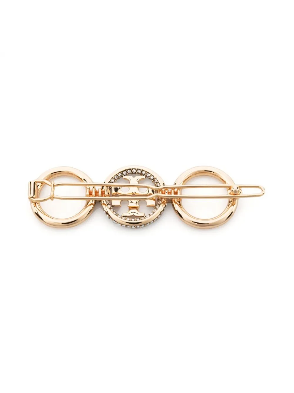 Miller Pavé Barrette hair pin from TORY BURCH featuring crystal embellishment, pavé setting, polished finish, logo plaque, French barrette fastening, gold-tone and brass.