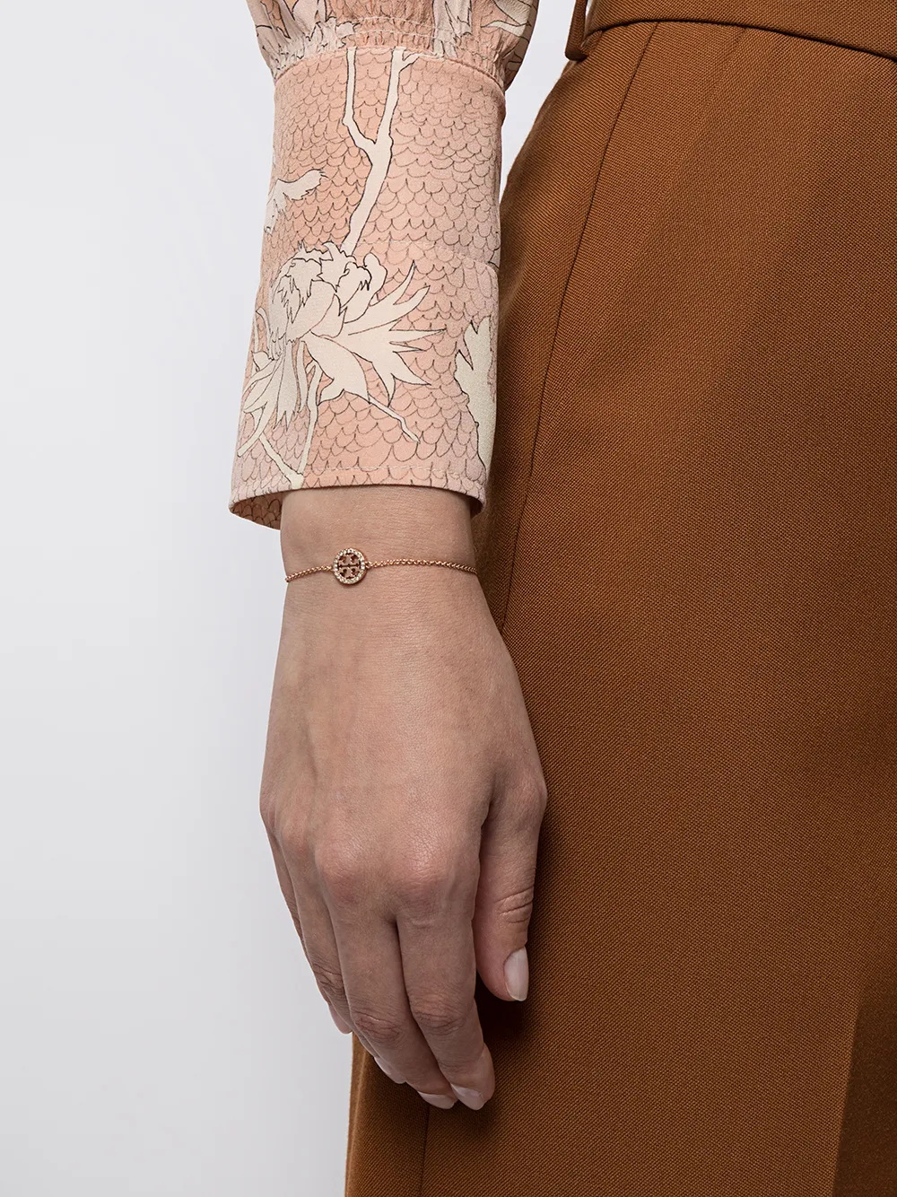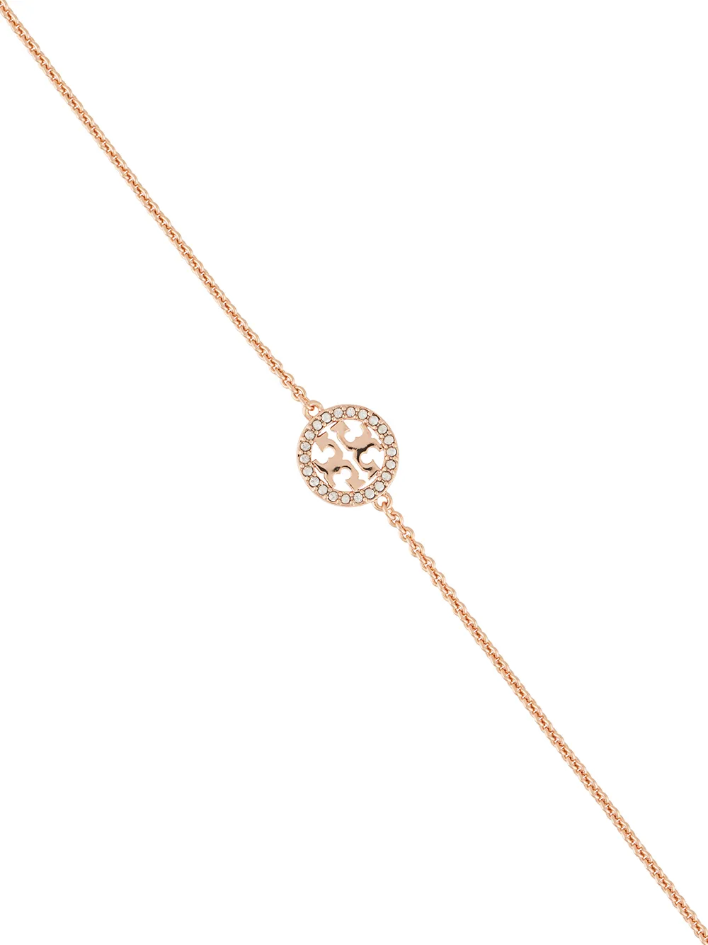 Gold-tone brass Miller chain bracelet from TORY BURCH featuring logo charm, crystal embellishment and spring-ring fastening.