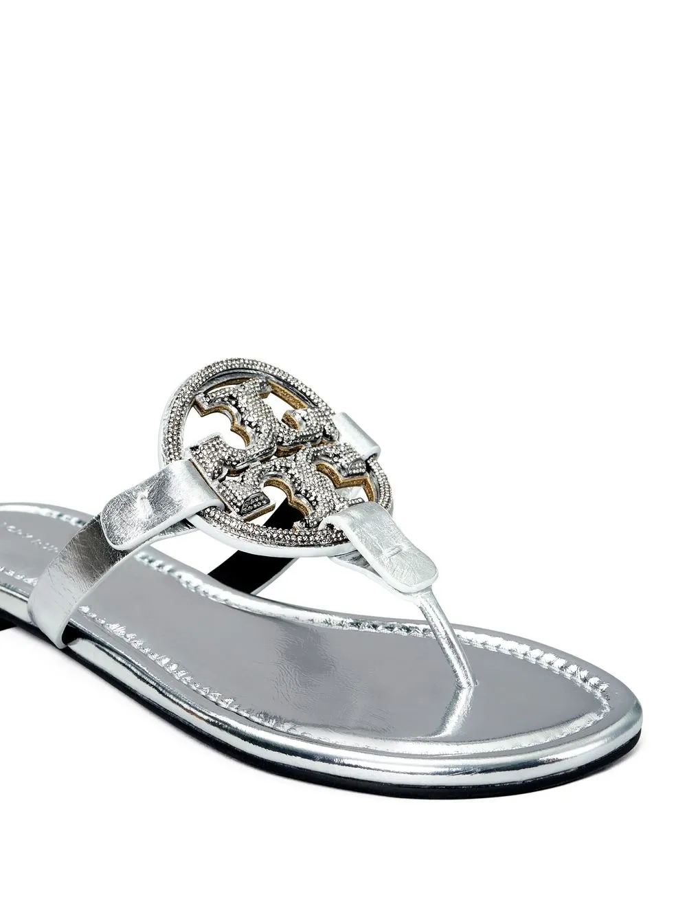 Miller pave logo sandals from TORY BURCH featuring silver-tone, leather, metallic finish, logo plaque, open toe and slip-on style.