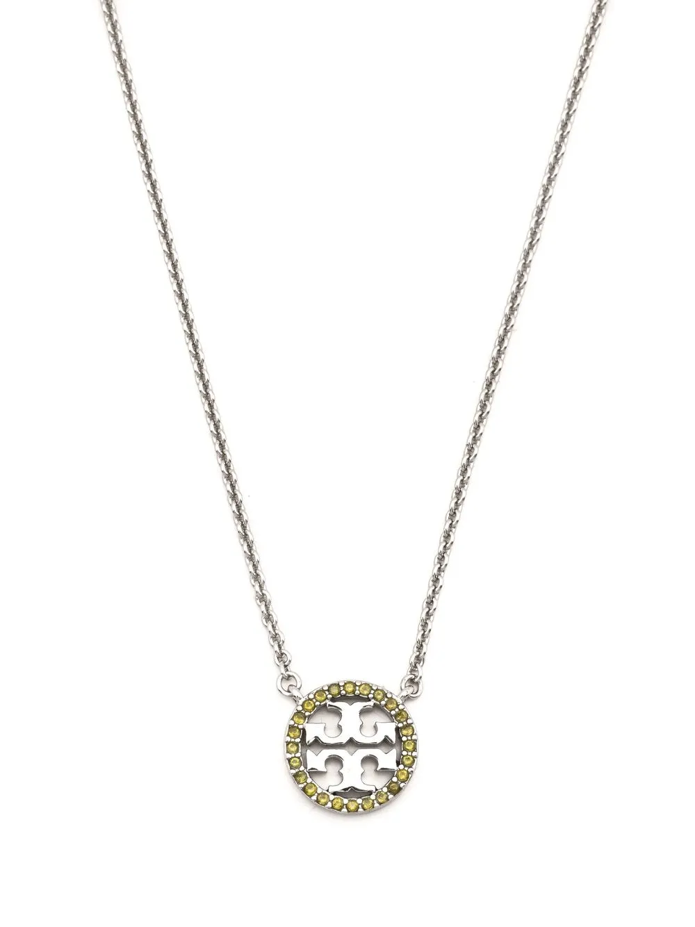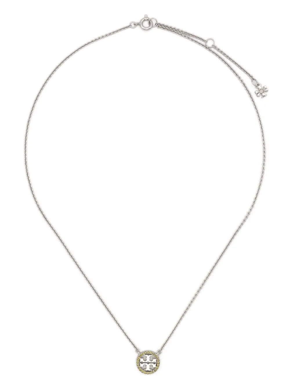 Miller penant necklace from TORY BURCH featuring silver-tone, rolo chain, logo pendant, crystal embellishment, adjustable fit and lobster claw fastening.