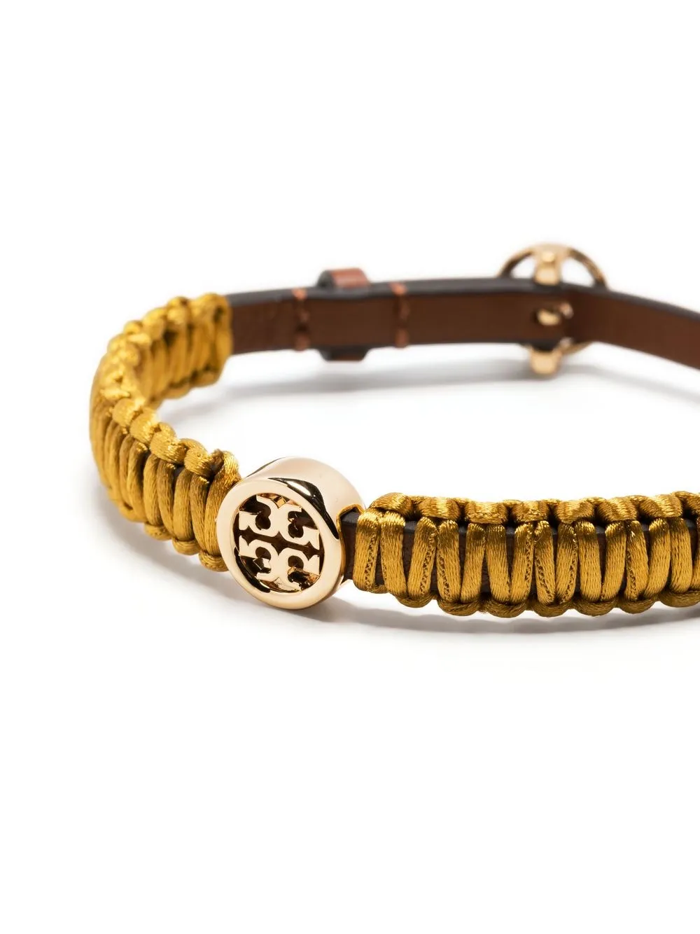 Miller silk leather bracelet from TORY BURCH featuring gold-tone, brown, calf leather, gold-tone logo plaque, charm detail and adjustable fit.