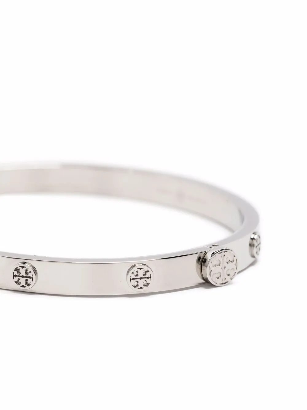 Silver tone Miller logo-charm bangle bracelet from TORY BURCH featuring logo plaque and slip-on style.