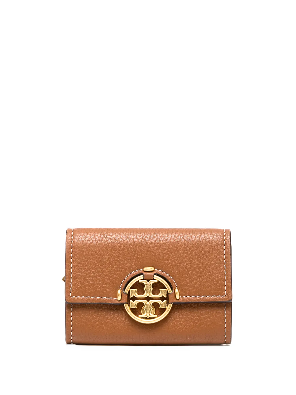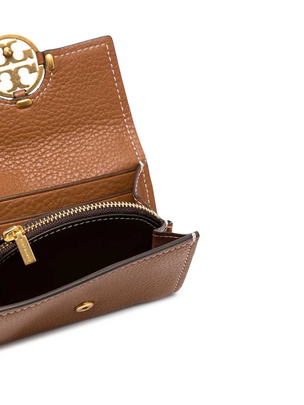 Brown leather mini Miller leather wallet from TORY BURCH featuring pebbled texture, gold-tone logo plaque, contrast stitching, foldover top with magnetic fastening, internal card slots and internal zip-fastening pocket.