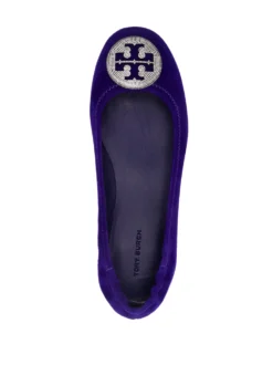 Minnie suede ballerina shoes from TORY BURCH featuring dark purple, calf leather, crystal embellishment, signature Double T motif, elasticated trim, round toe, memory foam insole, cushioned insole and rubber sole.