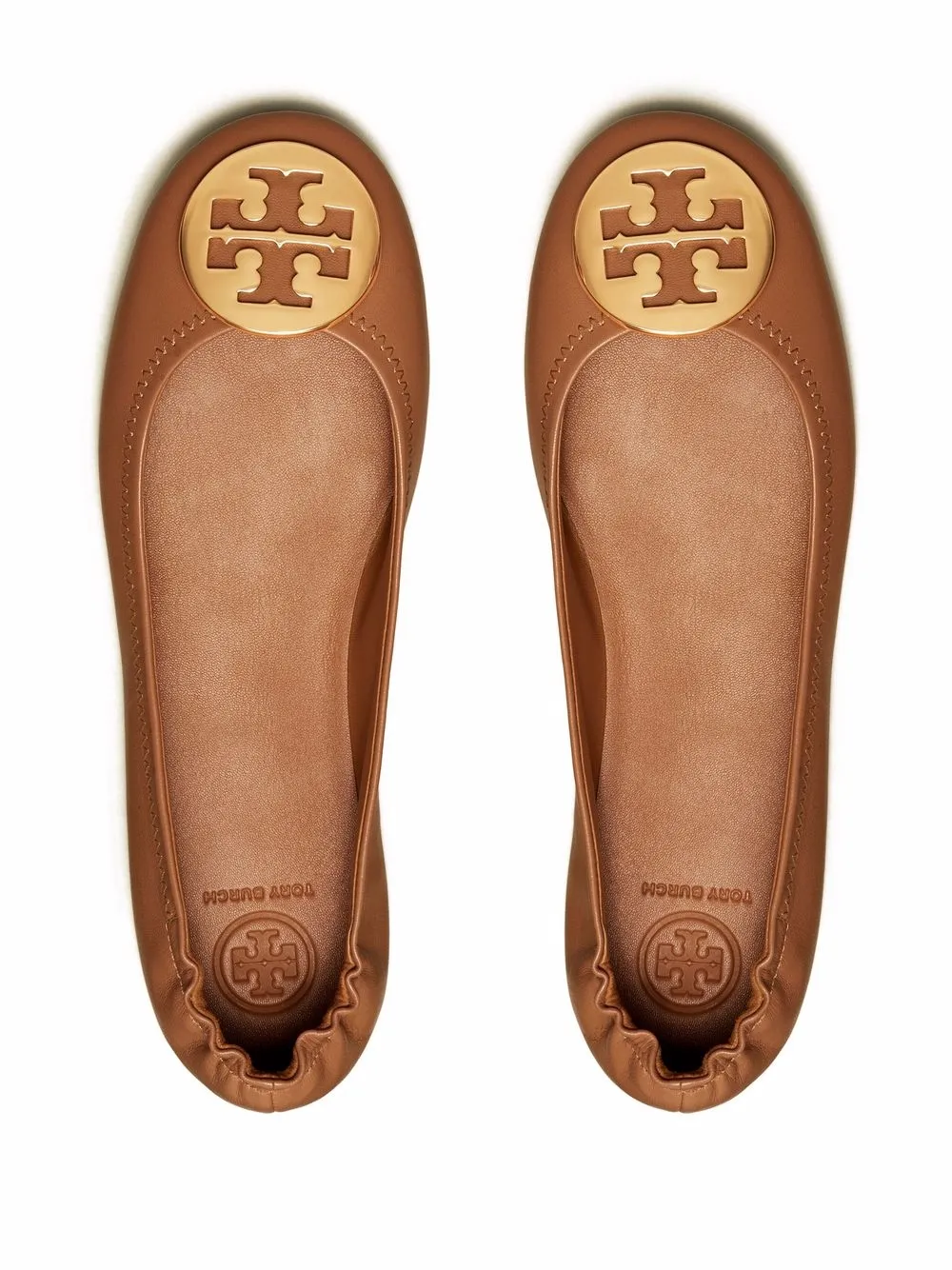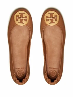 Royal tan brown leather Minnie travel ballet flats from TORY BURCH featuring round toe, branded insole, folding design, flat rubber sole and Double-T logo.