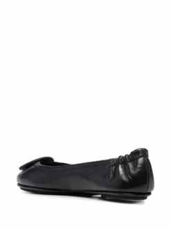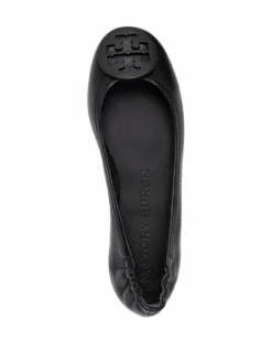 Black leather logo-plaque leather ballerinas from TORY BURCH featuring logo plaque, round toe, elasticated band and flat rubber sole.