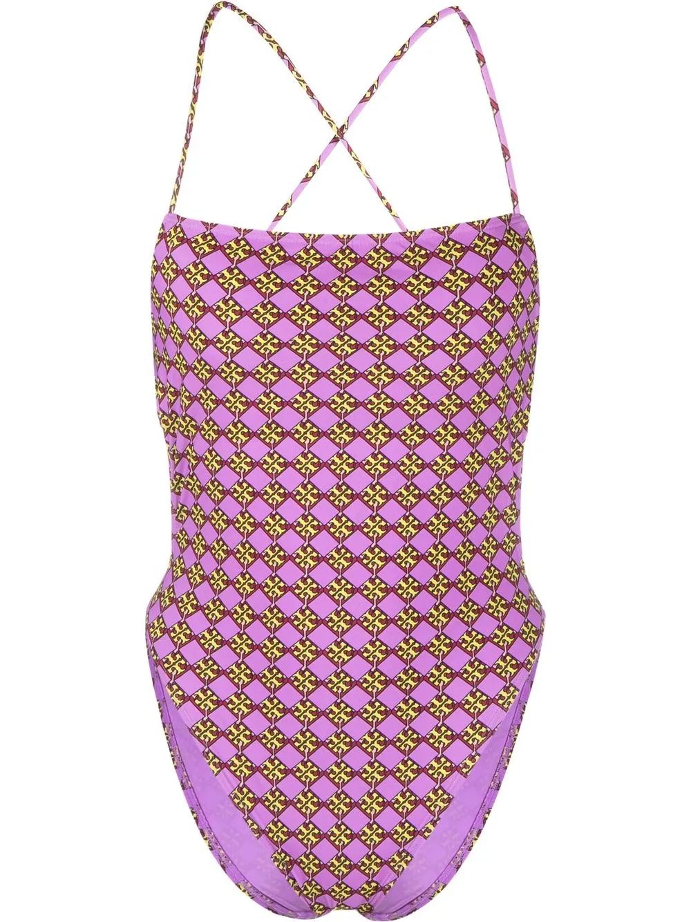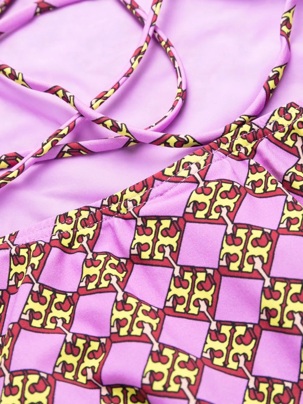 monogram-print swimsuit from TORY BURCH featuring lilac purple, banana yellow, monogram pattern, backless, halterneck and sleeveless. Be mindful to try on swimwear over your own garments..