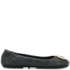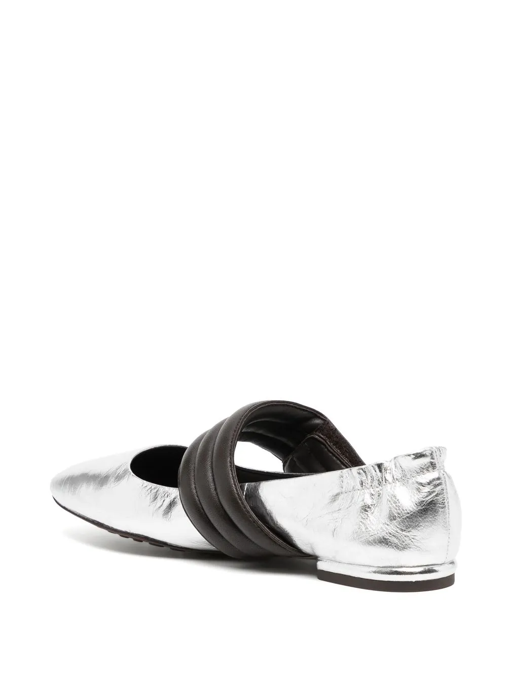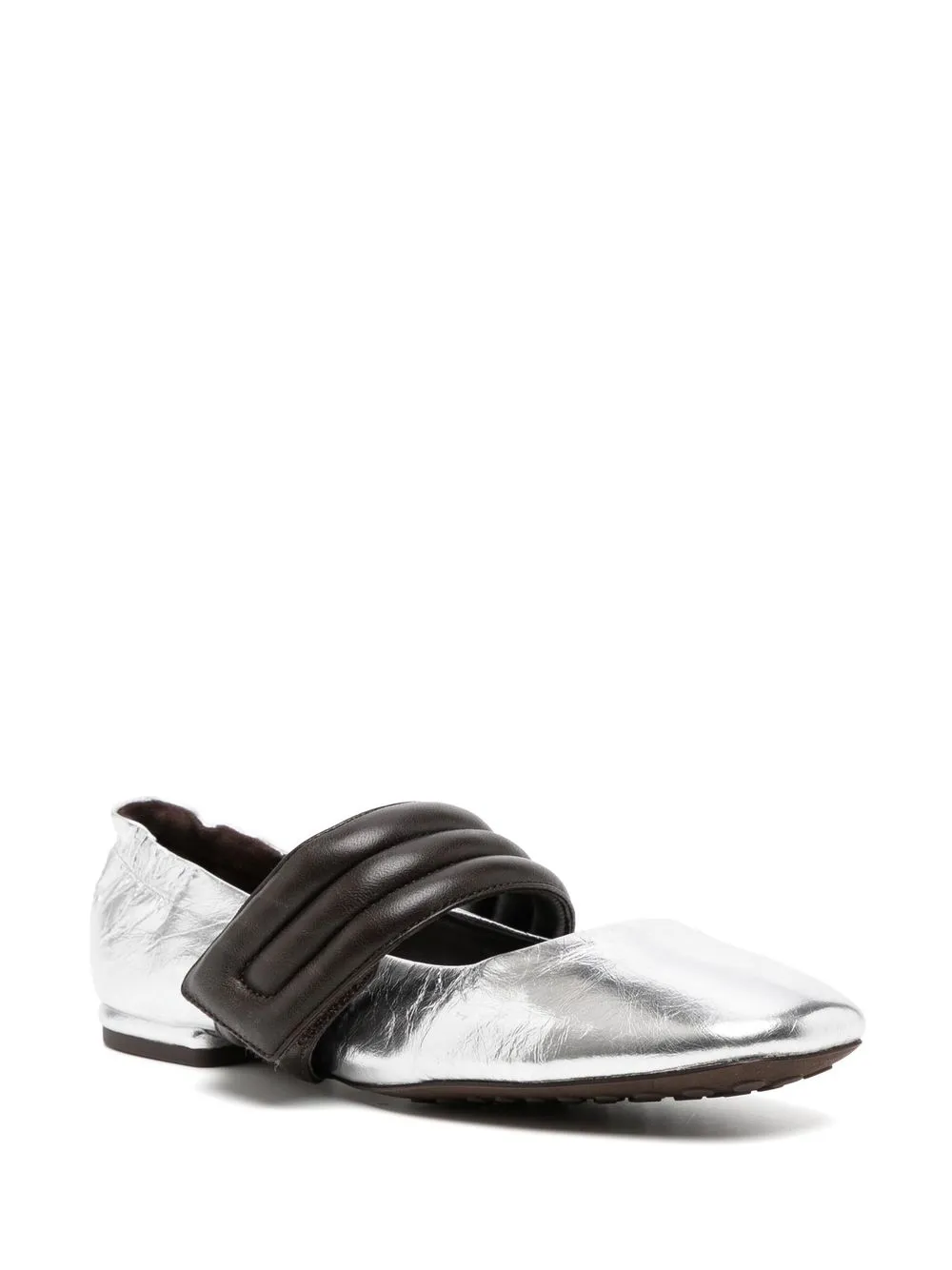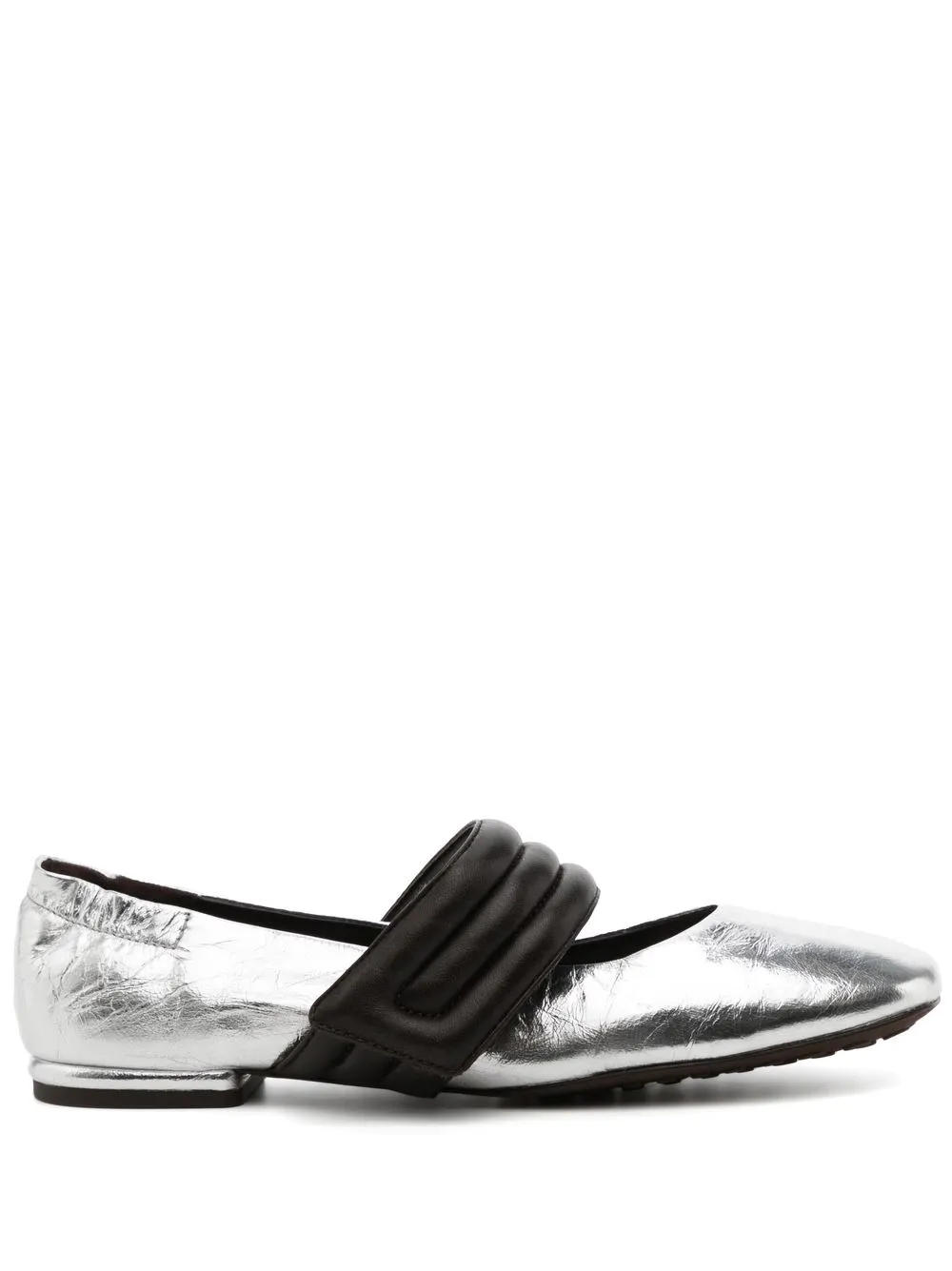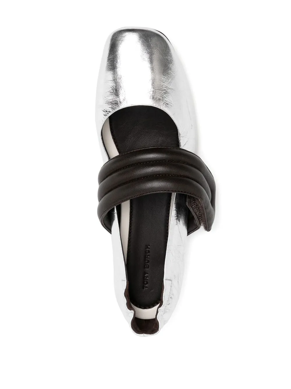 padded Mary-Jane 10mm ballerina shoes from TORY BURCH featuring silver-tone, calf leather, metallic sheen, padded panels, square toe, front touch-strap fastening, branded leather insole, low block heel and leather outsole.