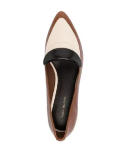 panelled leather loafers from TORY BURCH featuring light brown, white, black, leather, panelled design, branded insole, pointed toe, slip-on style and low heel.