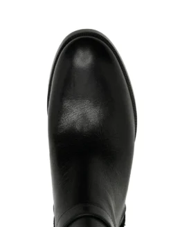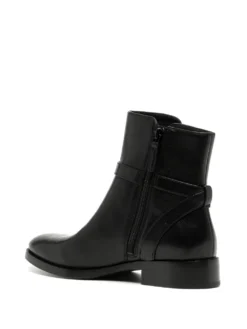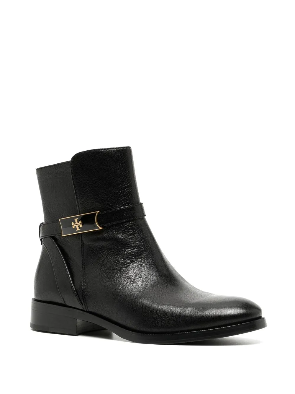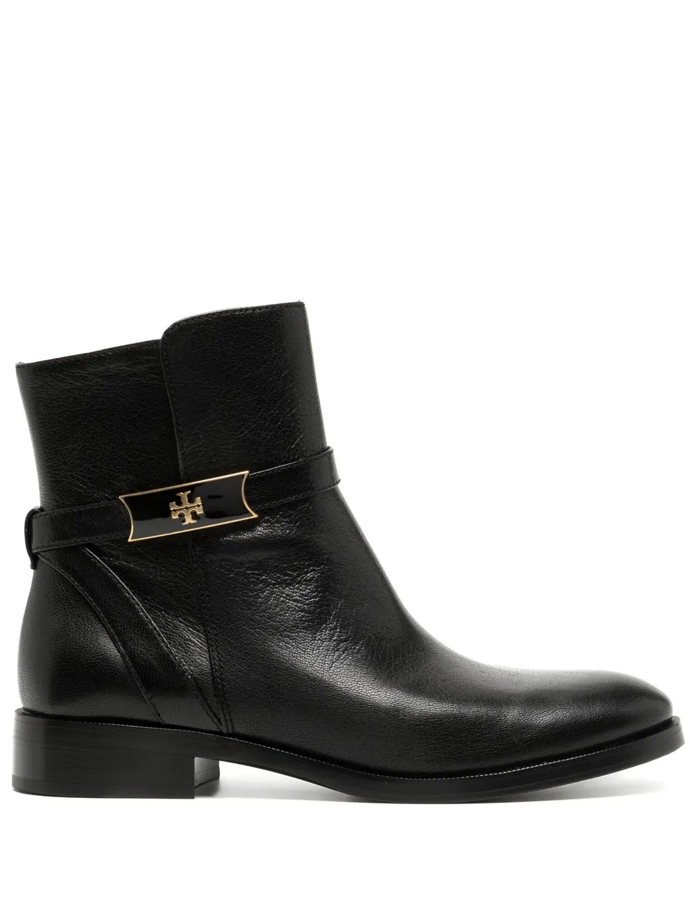 perrine leather ankle boots from TORY BURCH featuring black, leather, high-shine finish, gold-tone logo plaque, rubber sole, round toe, ankle-length and short side zip fastening.