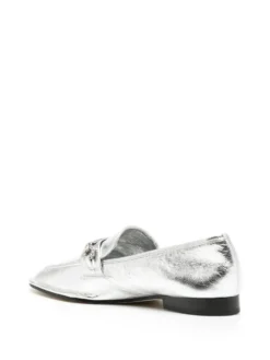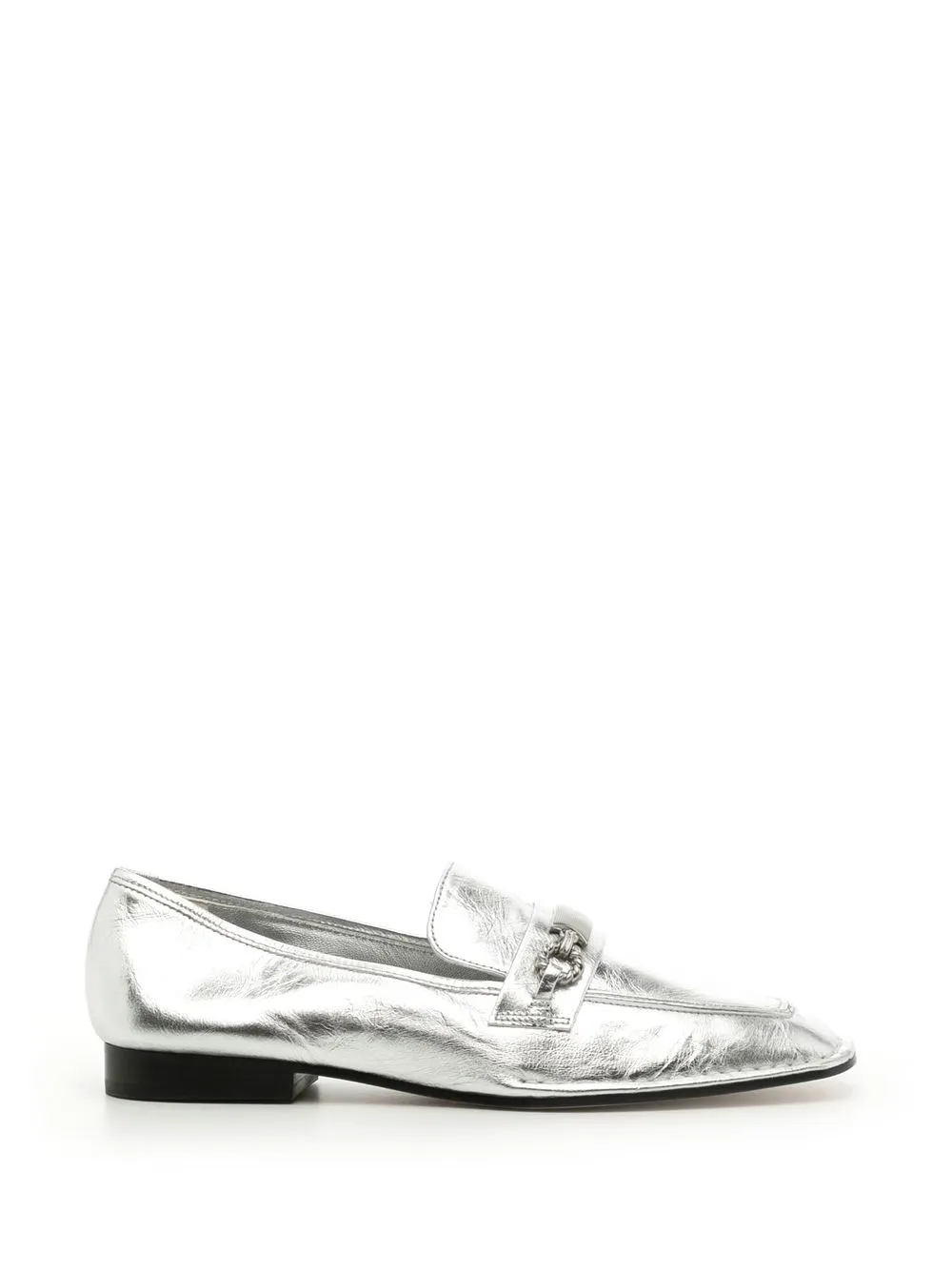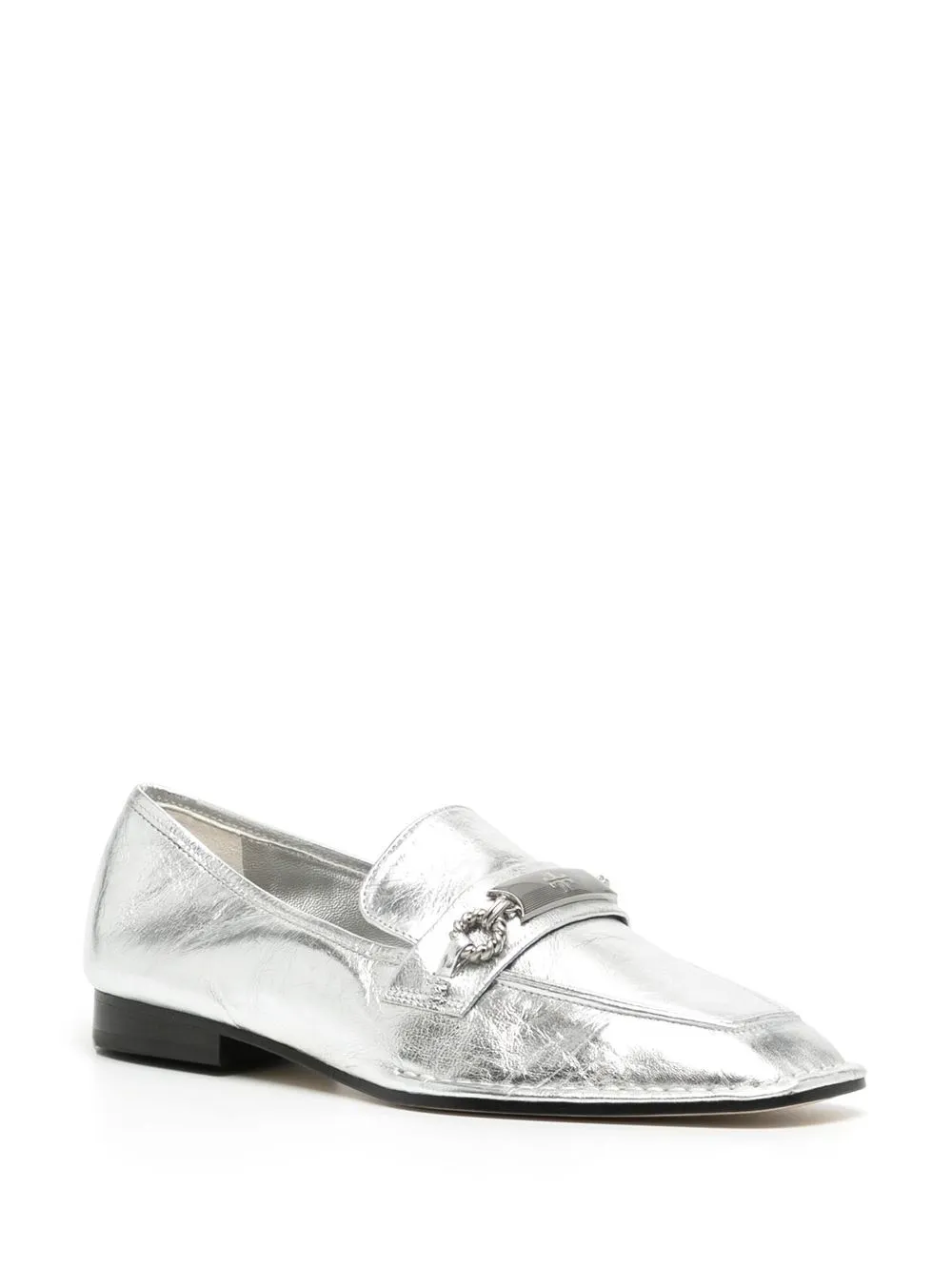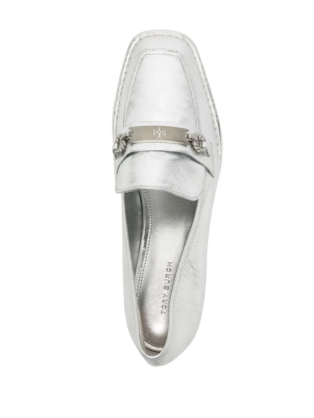 perrine silver loafer from TORY BURCH featuring silver plated, leather, square toe, bronze-tone logo plaque, flat sole and branded insole.