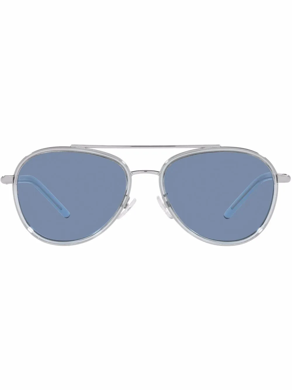 Blue/silver pilot-frame sunglasses from TORY BURCH featuring acetate, silver-tone hardware, blue tinted lenses and pilot frame. These glasses come with a protective case..