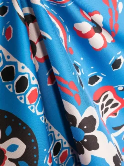 This blue scarf from Tory Burch is enhanced with a collector’s edition print. It is crafted from silk and has a rectangular shape.