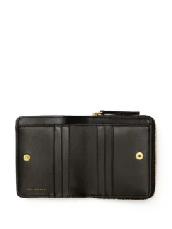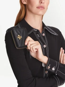 quilted logo-plaque purse from TORY BURCH featuring black, leather, quilted, gold-tone logo plaque, internal logo stamp, top zip fastening, front button fastening, coin pocket, internal card slots and note compartment.