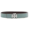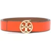 reversible leather belt from TORY BURCH featuring leather, logo-buckle fastening, reversible, pre-drilled holes, flat tip and yellow/ lavender purple.