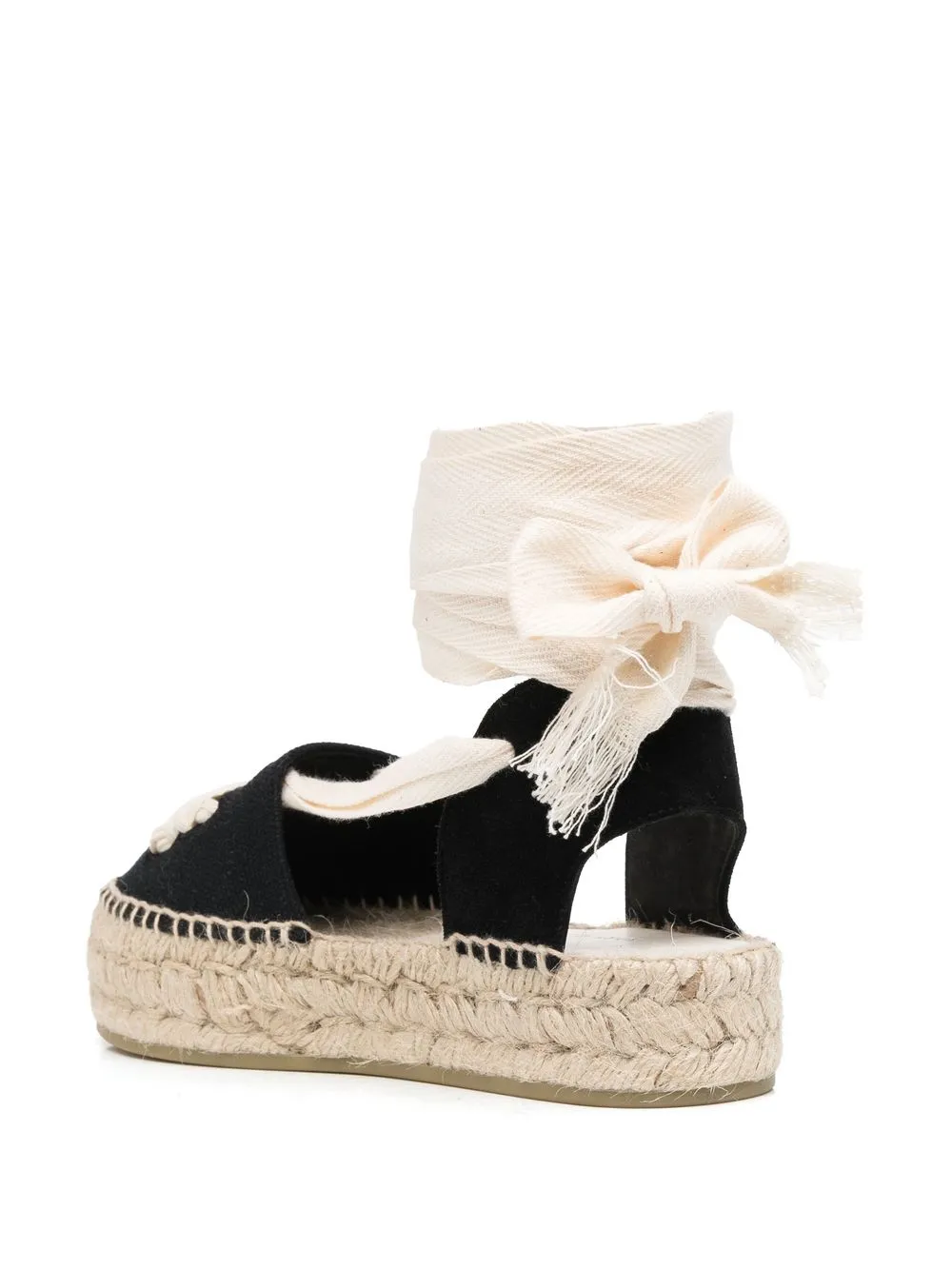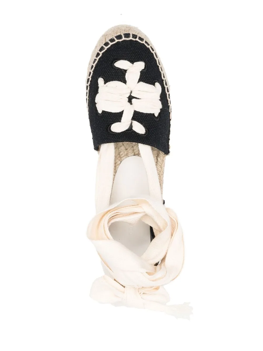 Ribbon woven-logo espadrilles from TORY BURCH featuring black/white, cotton, calf leather, embroidered logo to the front, round toe, tie-fastening ankle strap, branded insole and braided raffia platform.