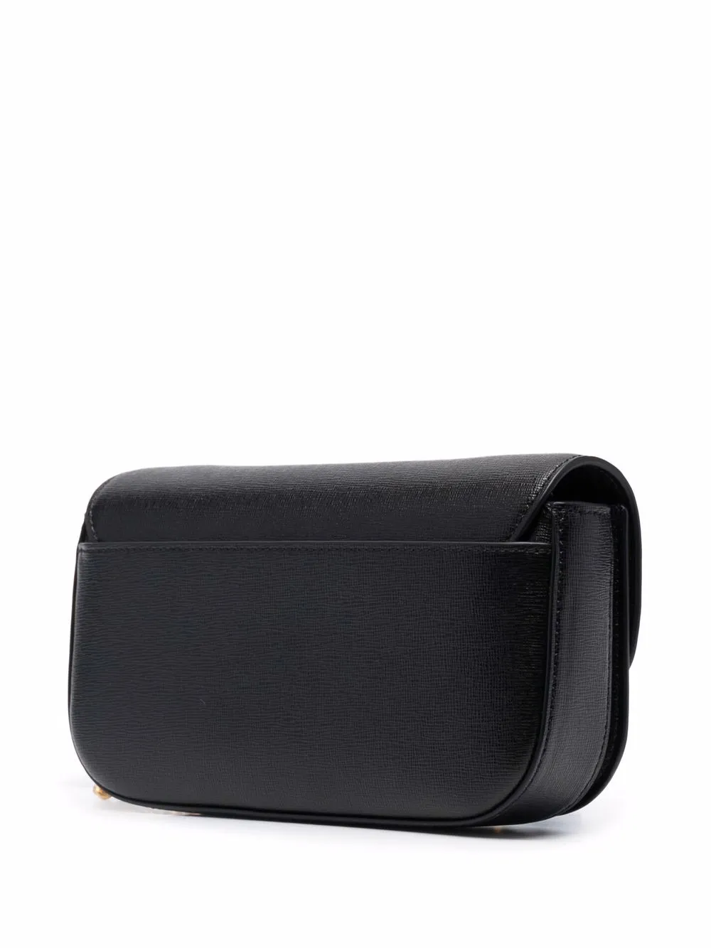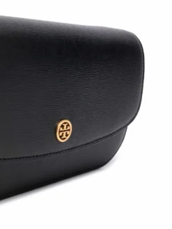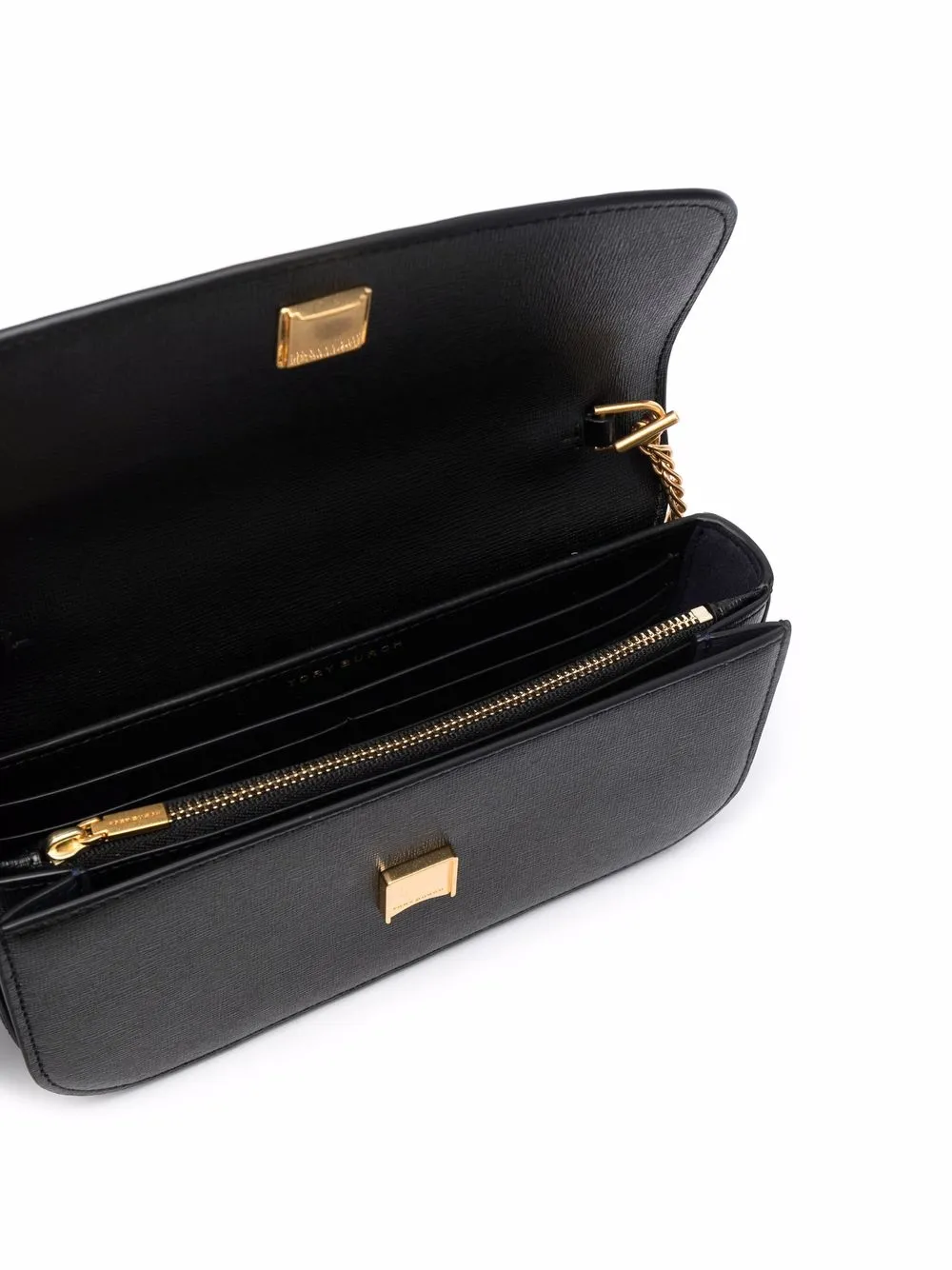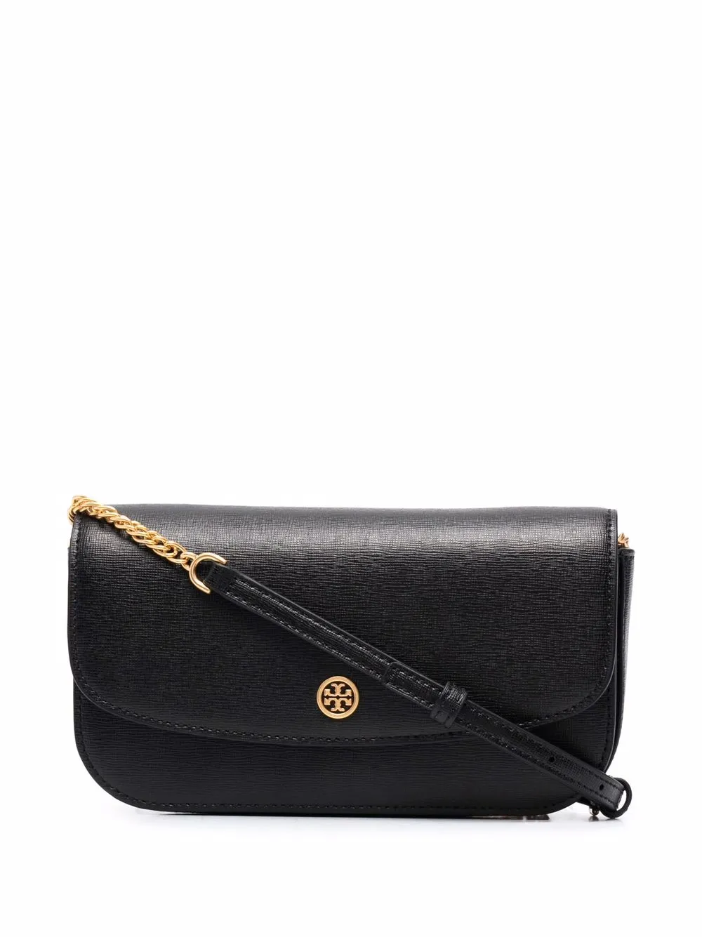 Black leather Robinson chain-strap crossbody bag from TORY BURCH featuring logo plaque, foldover top with snap fastening, clasp fastening, adjustable leather and chain-link shoulder strap, internal card slots, internal zip pocket and leather lining.